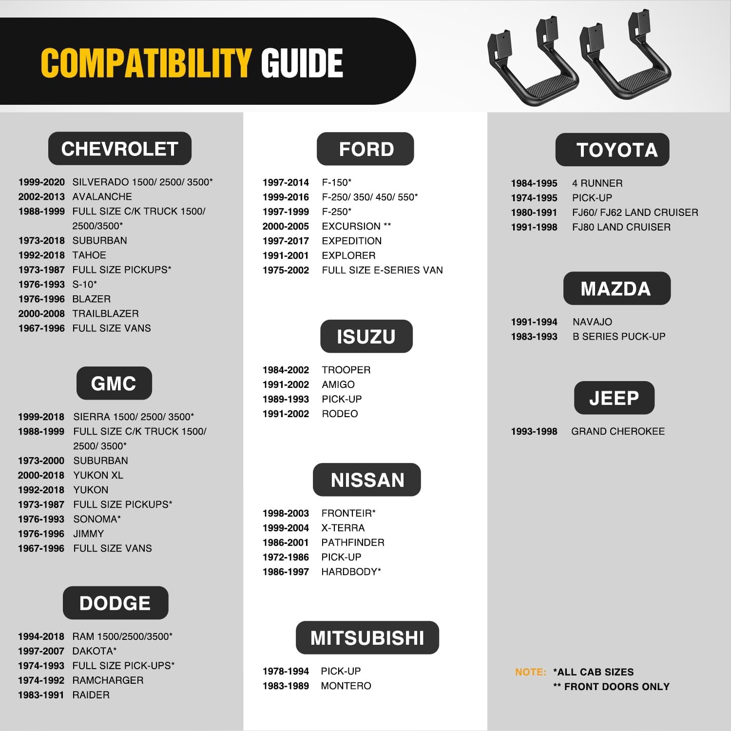 - 【PACKAGE INCLUDED】- The package includes 4Pcs Side Steps, Necessary Mounting Hardwares, and Installation Instructions. If you have any questions or problems, please contact us.