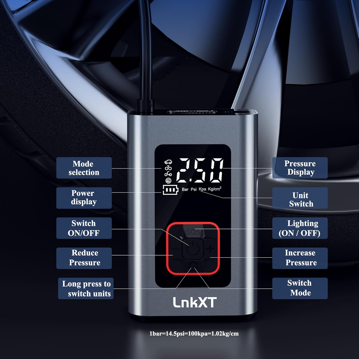 - Fast Inflation for Quick and Easy Use – Featuring a high-performance motor, this air pump ensures rapid inflation, provides a maximum pressure of 150 PSI,allowing you to quickly inflate car tires, bike tires, motorcycles, and various inflatable items within minutes. , This smart portable air compressor can automatically shut off when desired pressure is reached, with preset and monitor tire pressure