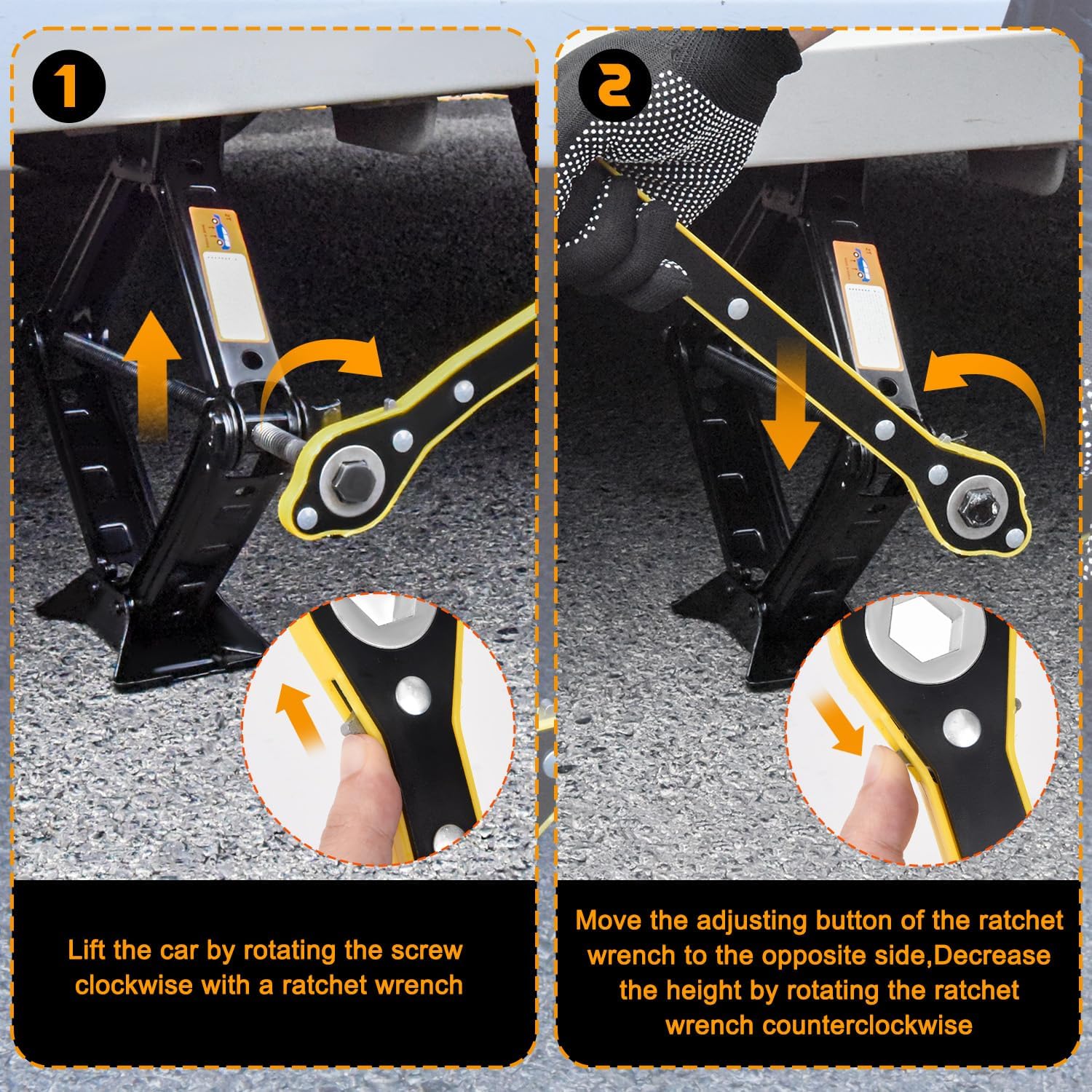 - ăEasy to UseăThe scissor jack has a simple and easy-to-operate design, while the lug wrench and tire changing kit are designed to provide a comfortable grip and maximum leverage.For any emergency, this Car Jack Kit will help you change your tire fast and easy.