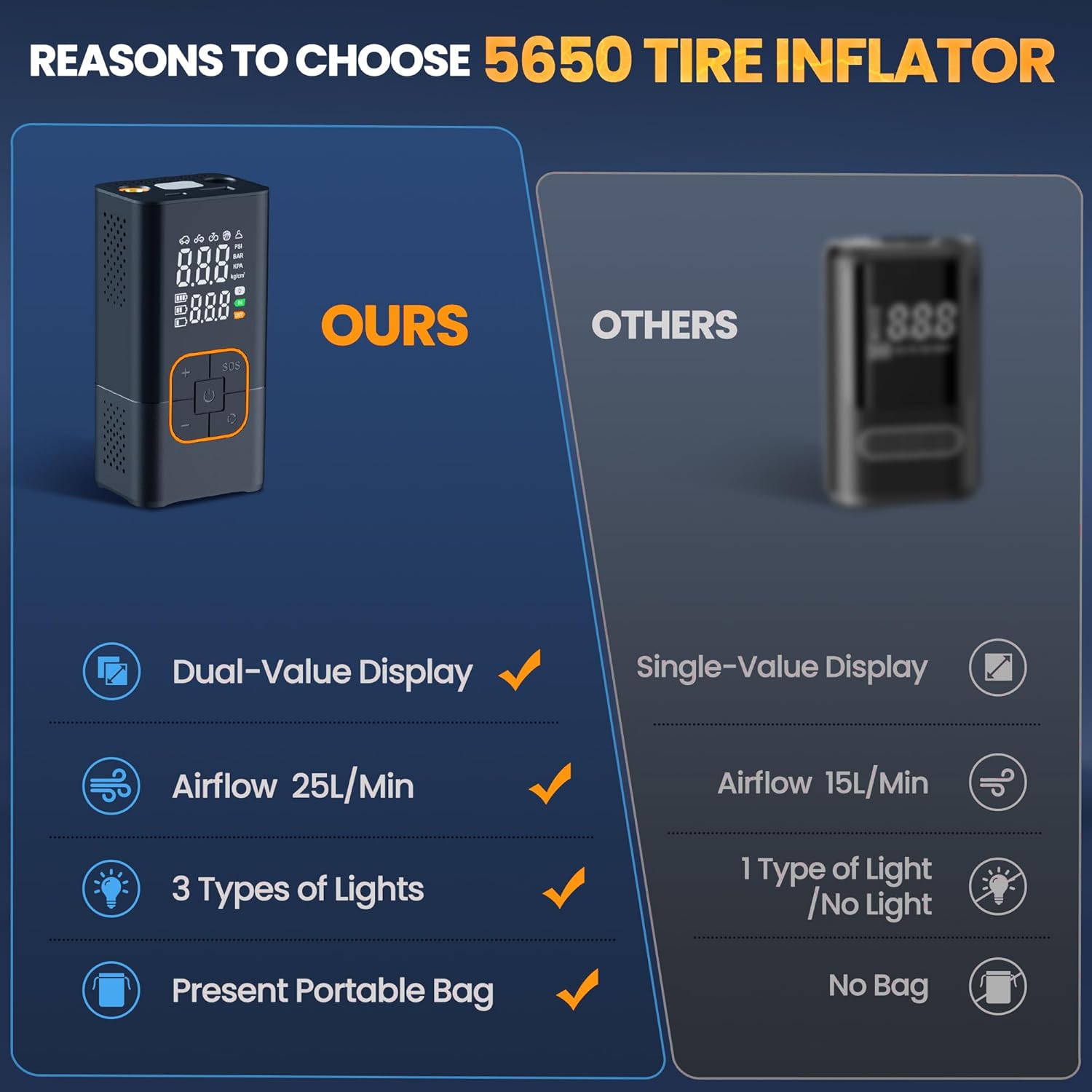 - Tire Inflator Portable Air Compressor - Efficiency and time-saving are hallmarks of this air compressor. Featuring customizable pressure settings that go up to 150 PSI, the electric air pump delivers 2X faster inflation with an airflow rate of 25 L/Min. Capable of inflating small car tires [29-36PSI] in roughly 1 minute, it meets a broad spectrum of inflation needs