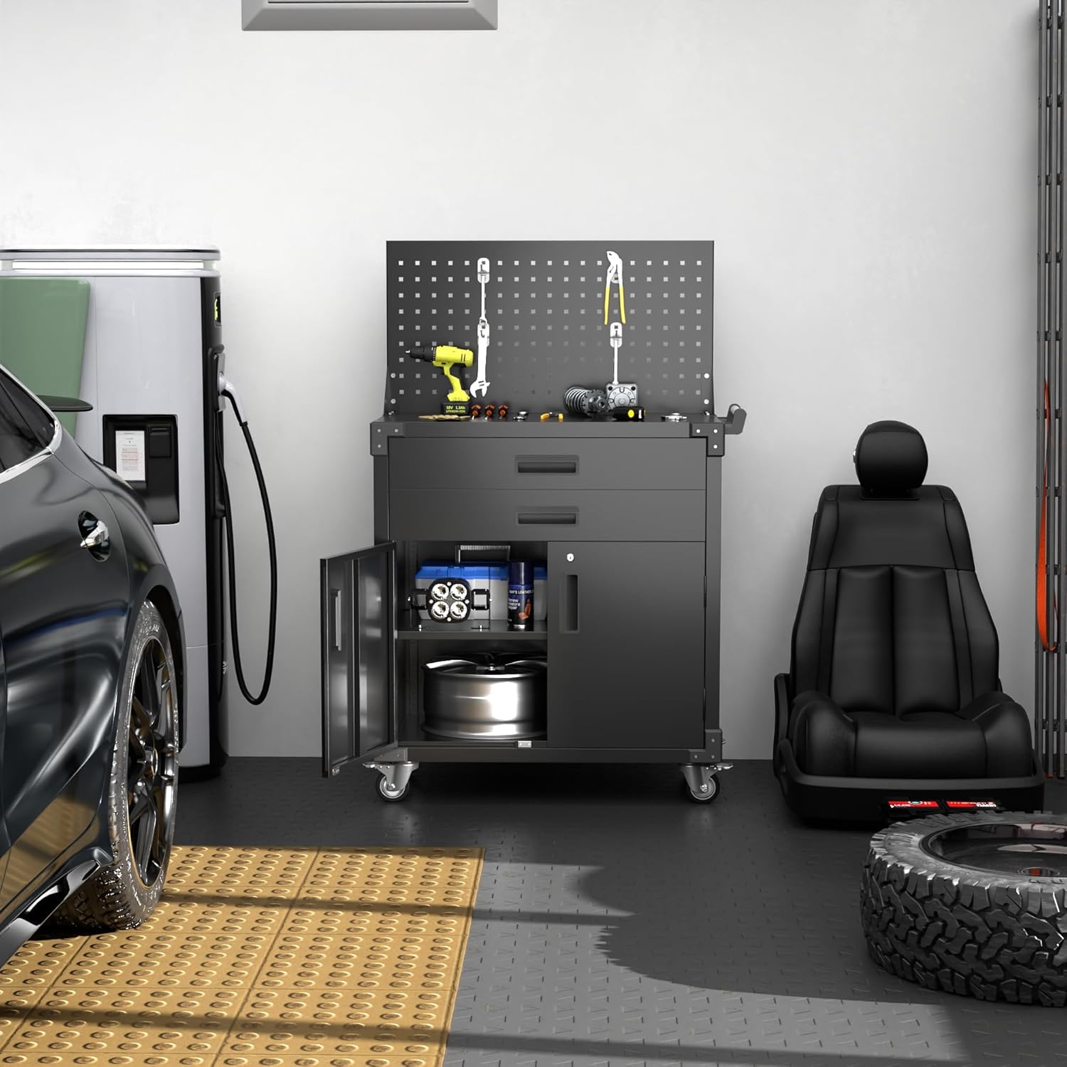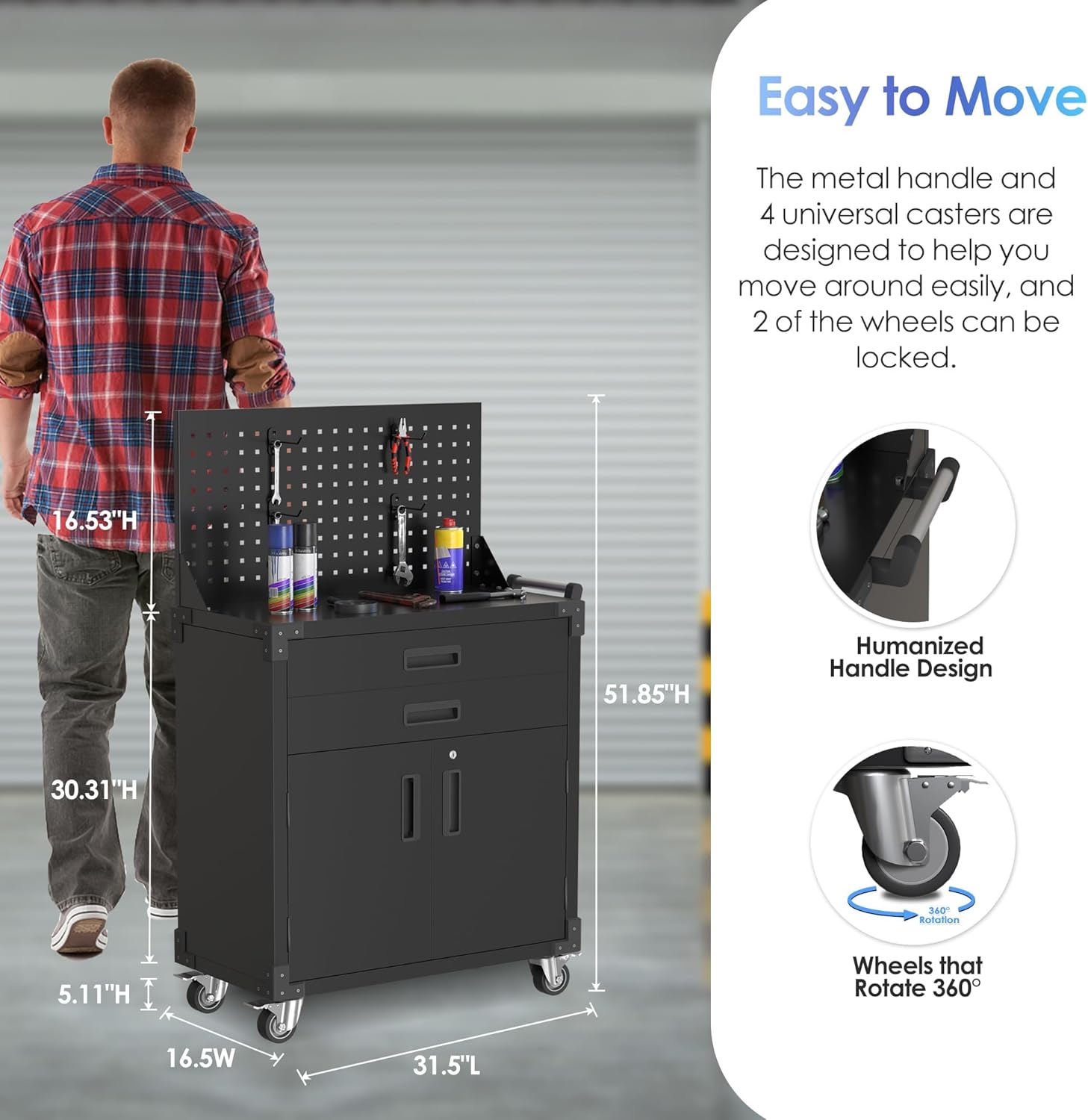 Black Tool Cart with Pegboard and 4 Hooks,Garage Storage Cabinet on Wheels with 2 Drawer,Industrial Service Utility Tool Cart for Mechanics, Garage, Workshop