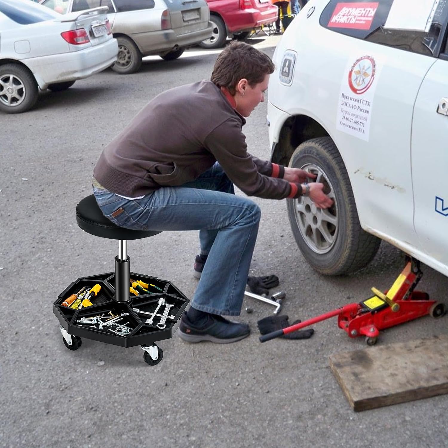 - 【 Wide Usage & Easy Installation 】 With a minimalist look and stylish color scheme, this versatile adjustable rolling stool can play an important role in your garage, workshop, dining area and keep your polishing, wheel washing, rubber cleaning and other tasks running smoothly. Moreover, the creeper seat is easy to install with simple steps for quick use.