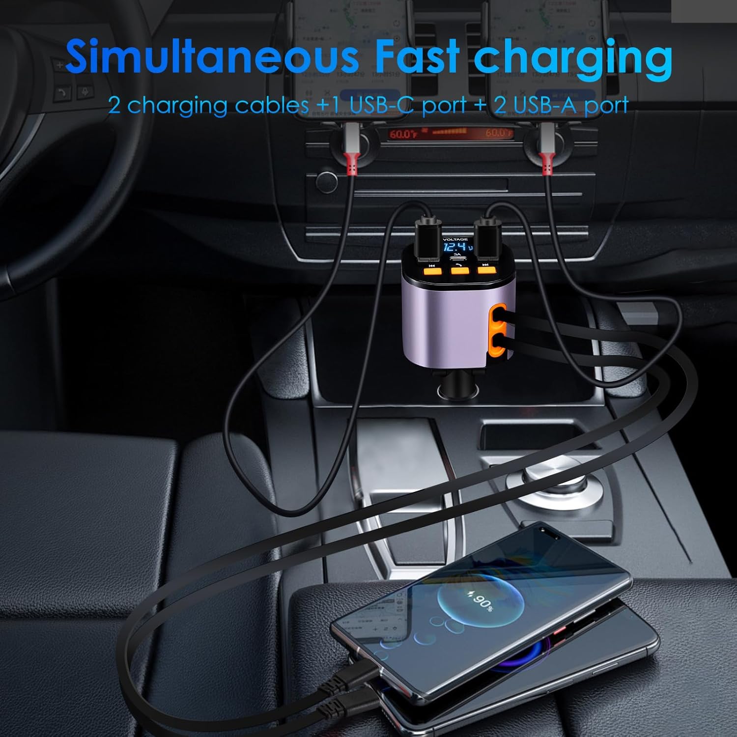 Retractable Car Charger,5 in 1 Fast Car Phone Charger 90W,Bluetooth 5.3 FM Transmitter Adapter,Handsfree Call,2 Retractable Cables and USB Cars Chargers for iPhone 15/14/13 (Purplr)