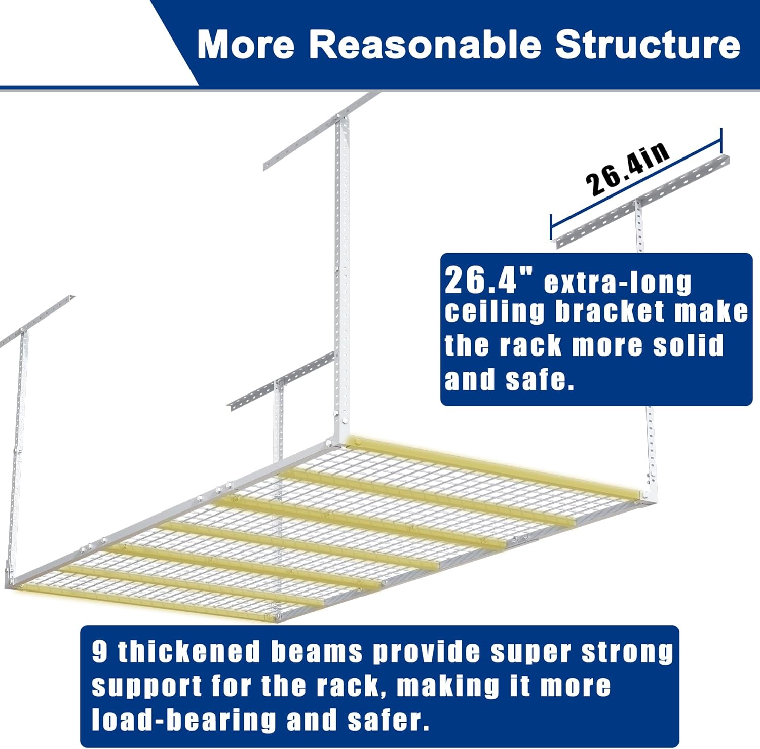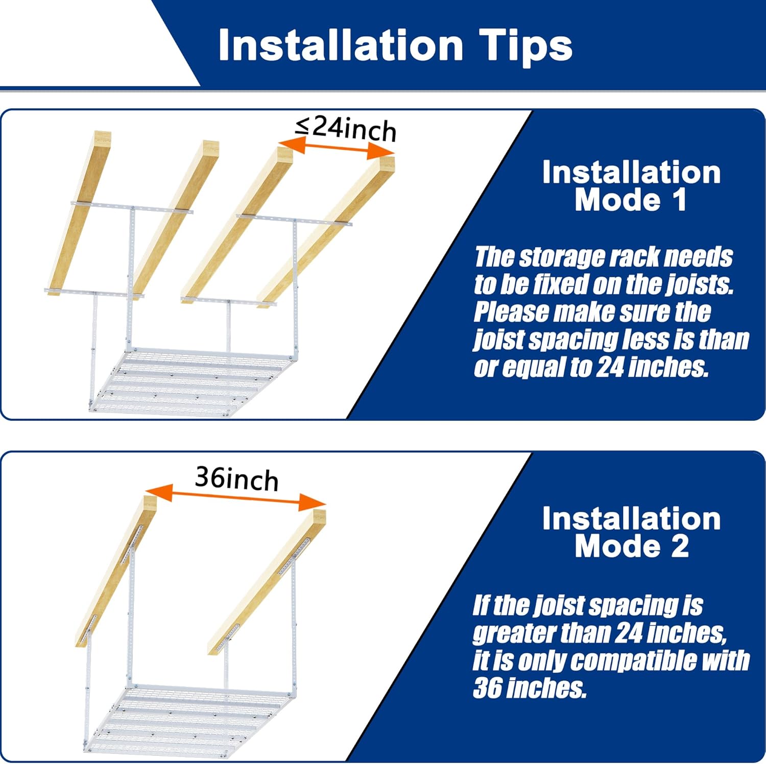 - EASY TO ASSEMBLY: Please refer to the instruction manual and install it step by step. According to the spatial characteristics of your garage, freely adjust the direction and height. Note: This ceiling storage rack is suitable for ceilings with joist spacing less than 24 inches. If the joist spacing is greater than 24 inches, it is only suitable for ceiling spacing of 48 inches.