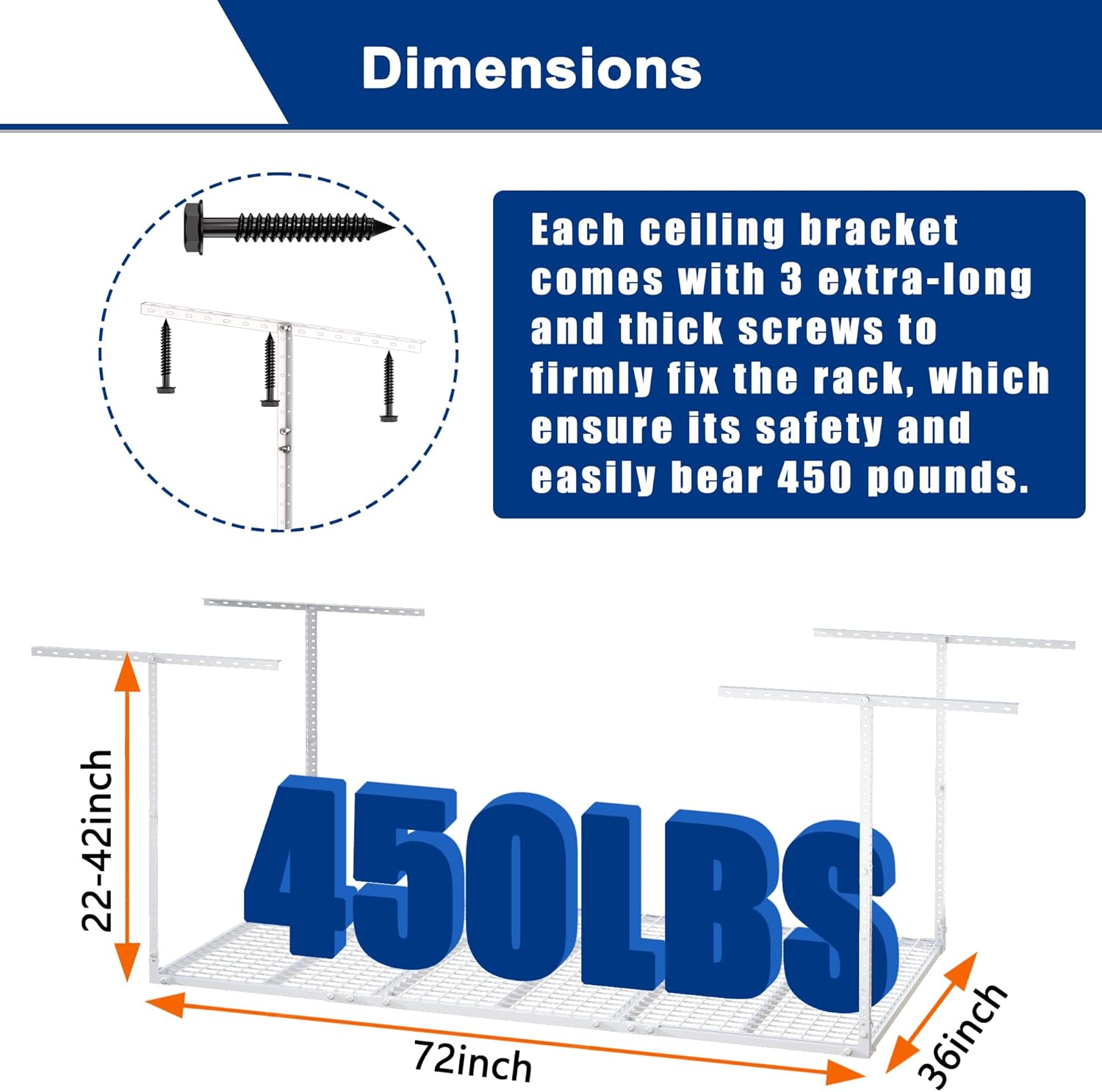 - STRUCTURE & SIZE: Thickened cold-rolled steel structure, integrally formed connectors. All hardware has undergone professional load-bearing tests, and the safe load-bearing capacity can reach 300 pounds. Dimensions of Garage shelves: 72" L x 36" W x 22-42" H