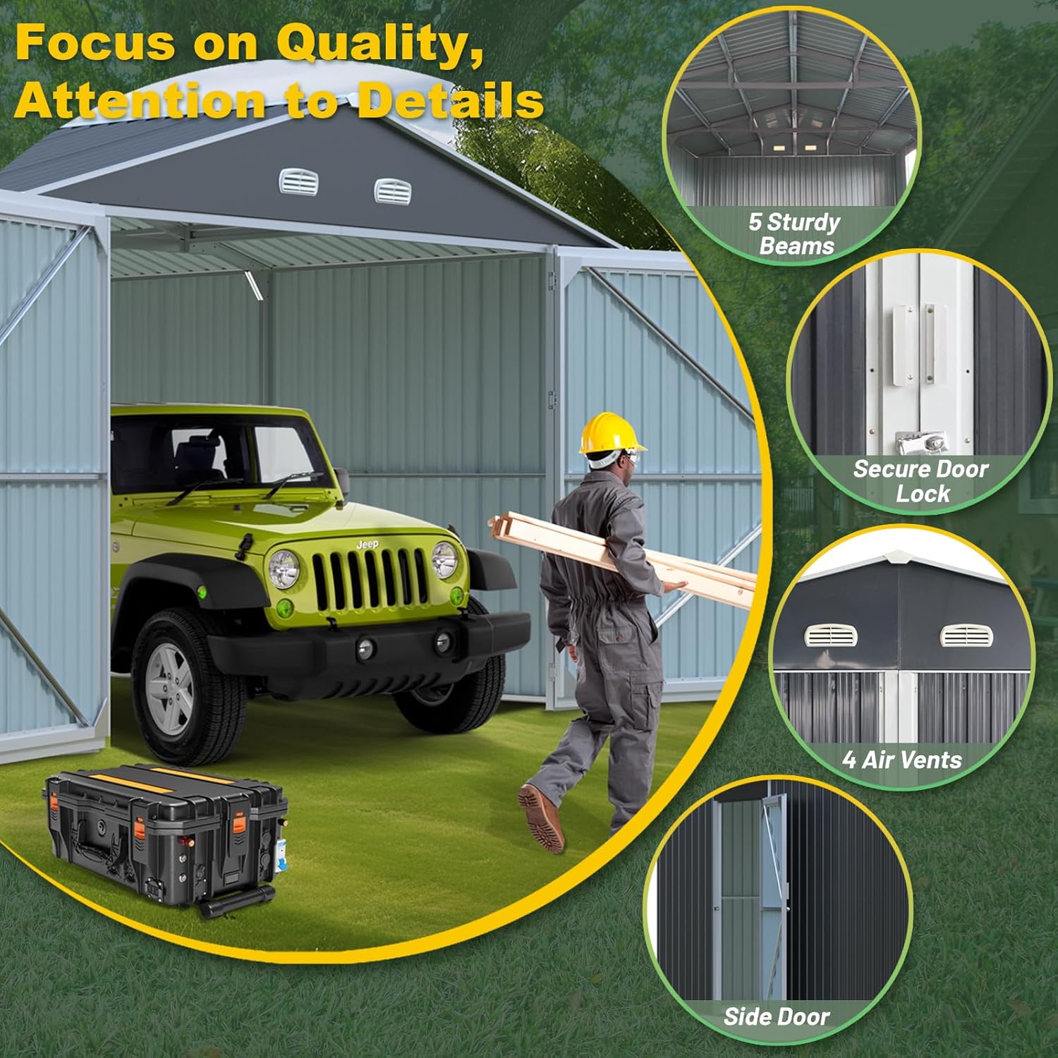 - Versatile Design with Easy Access: Featuring front double doors and a side door, this 20x13 FT outdoor shed offers easy access to your stored items. Whether for storage or as a workshop or children's play area, this metal garden shed adapts to your needs. Designed with four essential vents, it ensures optimal ventilation to prevent moisture build-up.