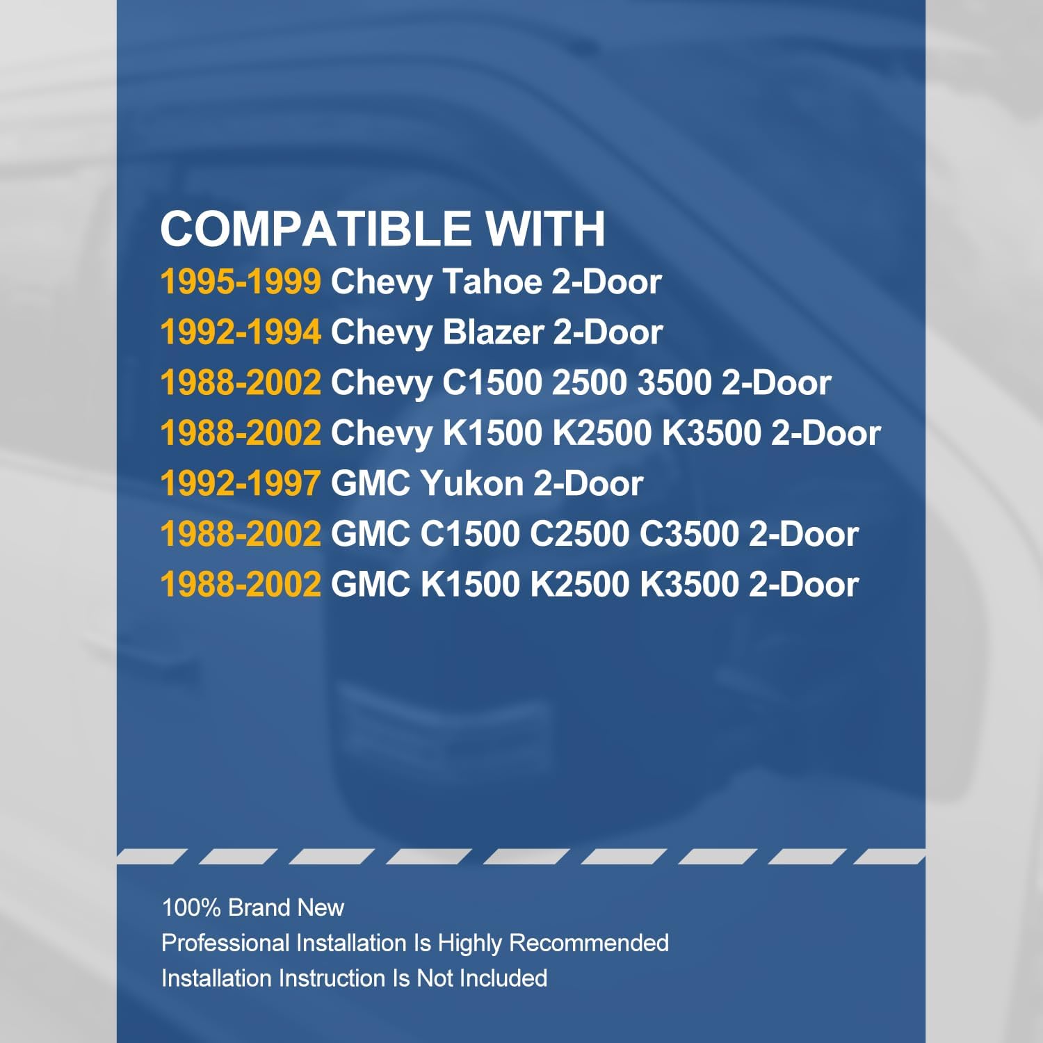 - Vehicle Compatibility - Window Visors Compatible with 95-99 Chevy Tahoe 2-Door, 92-94 Chevy Blazer 2-Door, 88-02 Chevy C1500 2500 3500 K1500 K2500 K3500 2-Door, 92-97 GMC Yukon 2-Door, 88-02 GMC C1500 C2500 C3500 K1500 K2500 K3500 2-Door, Fits Fleetside Models Only