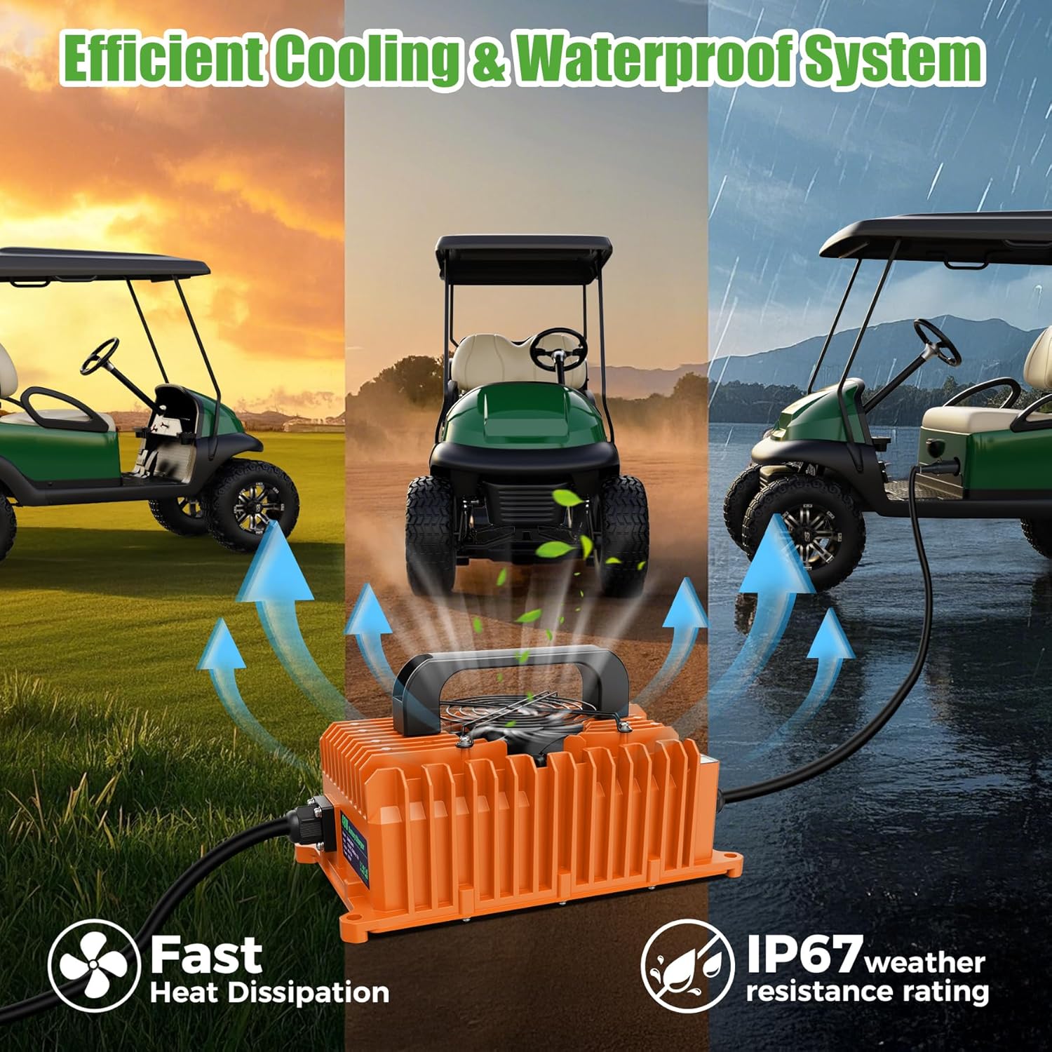 - Efficient Cooling & Waterproof System: Our golf cart charger built with an aluminum casing and powerful cooling fans, preventing overheating during charging, With an IP67 weather resistance rating, you don't have to worry about your charger being damaged by water, dust or vibration.