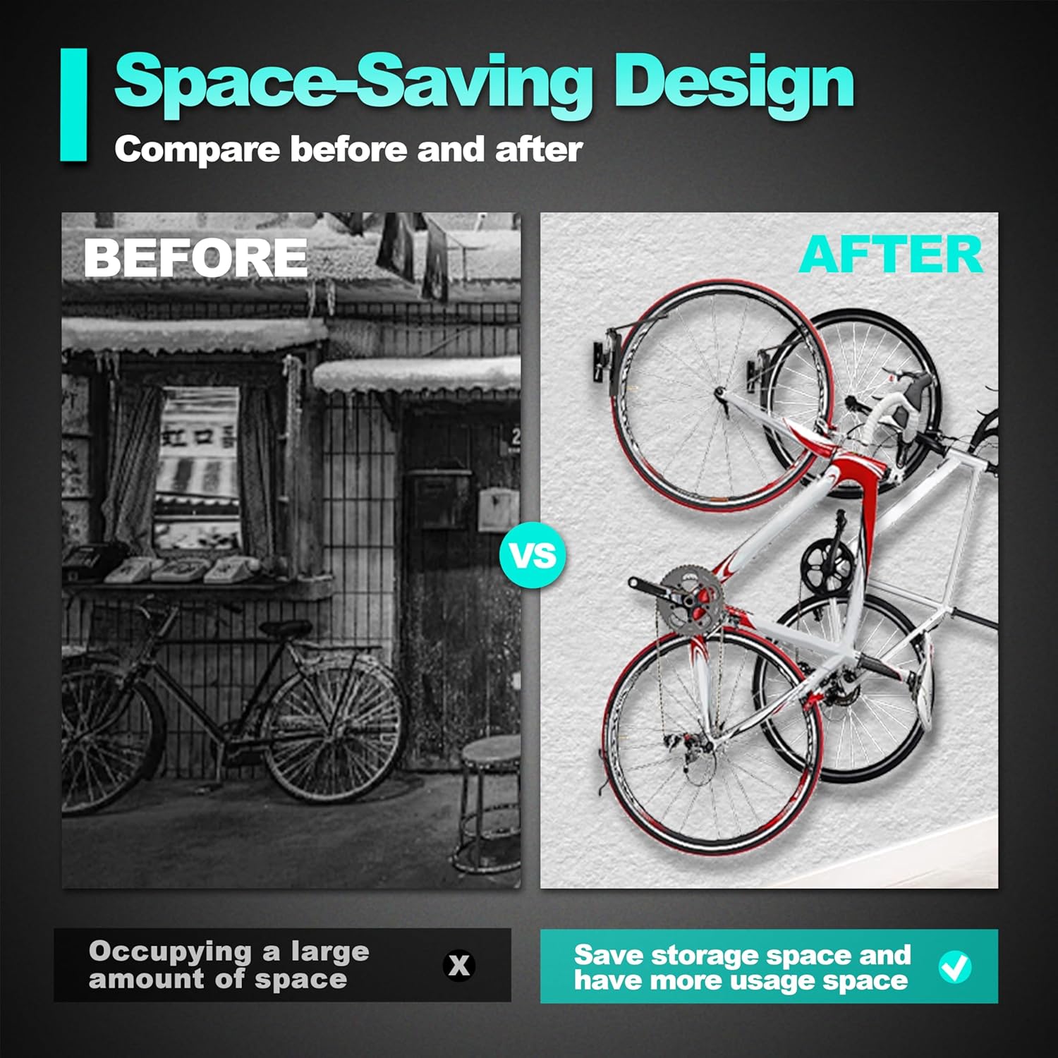 - [Versatile Bike Compatibility] bike rack garage can support storing various styles of bikes, such as road bikes, mountain bikes, e-bikes, kids' bikes, etc. bicycle wall mount fits bicycle tires up to 2.6 inches wide and 29 inches in diameter. bike hangers for garage each can hang weight of up to 30 kg/66.2 lbs.