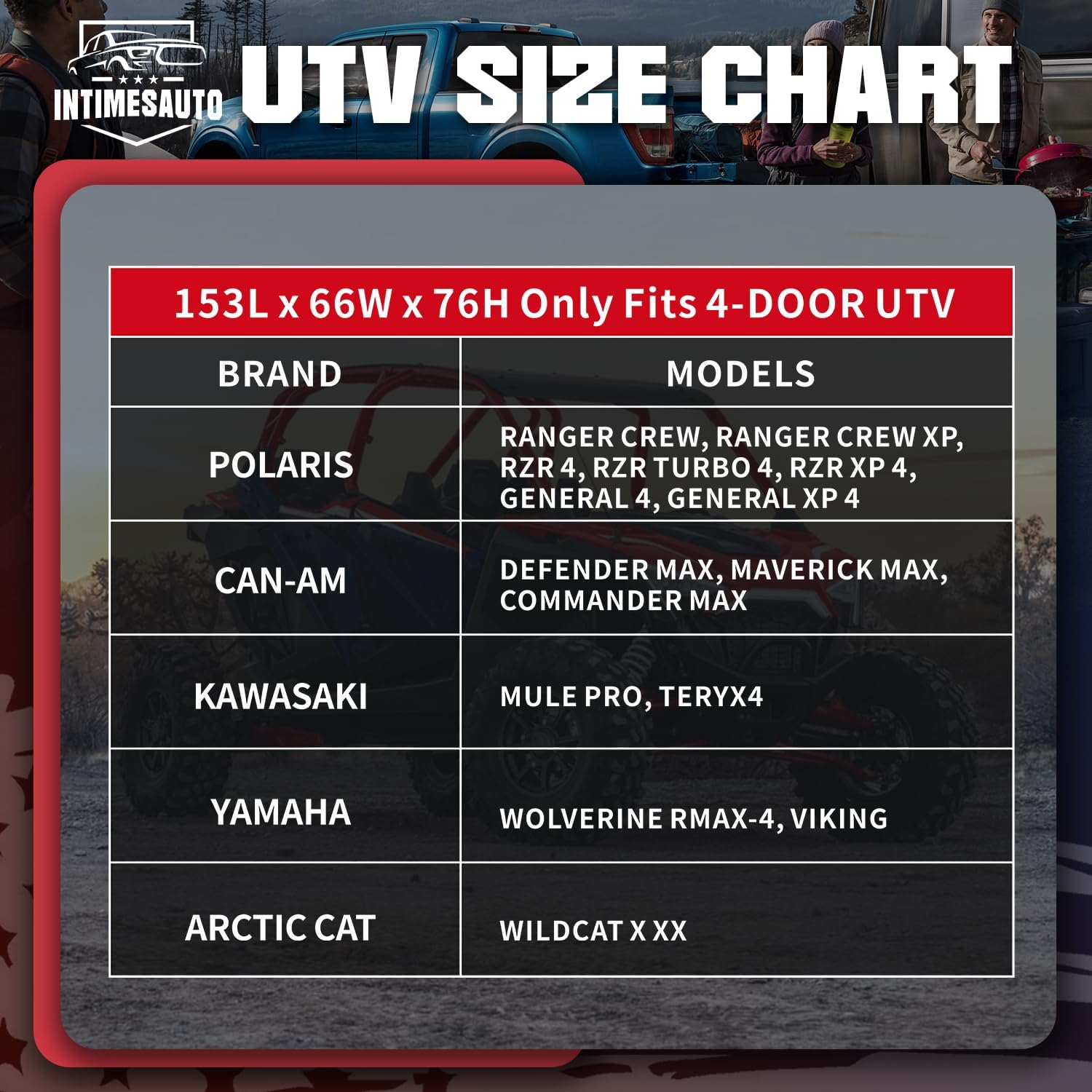 - CONFIRMEDIFT TOOL: These UTV covers (153L x 66W x 76H) are compatible with 2000 2001 2002 2003 2004 2005 2006 2007 2008 2009 2010 2011 2012 2013 2014 2015 2016 2017 2018 2019 2020 2021 2022 2023 2024 most 2-ROW UTV 4 wheeler: a. Polaris Ranger Crew, Ranger Crew XP, RZR 4, RZR Turbo 4, RZR XP 4, General 4, General XP 4; b. Can-Am Defender Max, Maverick Max, Commander Max; c. Kawasaki Mule Pro, Teryx4; d. Yamaha Wolverine RMAX-4, Viking; e. Arctic Cat Wildcat X XX