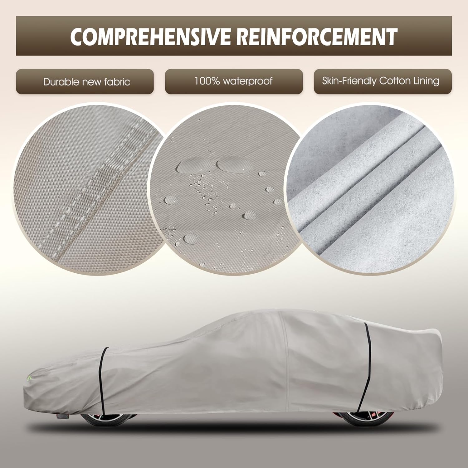 - Wind-Resistant Design: The car cover waterproof all weather has been specially designed to resist strong winds. 1) Equipped with two bungee cords, which only take a few seconds to tie to the tires on both sides, it securely covers the front and rear of the car. 2) There are specially designed windproof straps at the bottom to pass through the car's middle to ensure that the cover is not blown away. 3) The adjustable elastic hem makes it easy to adjust the size and fix the cover to the car body.