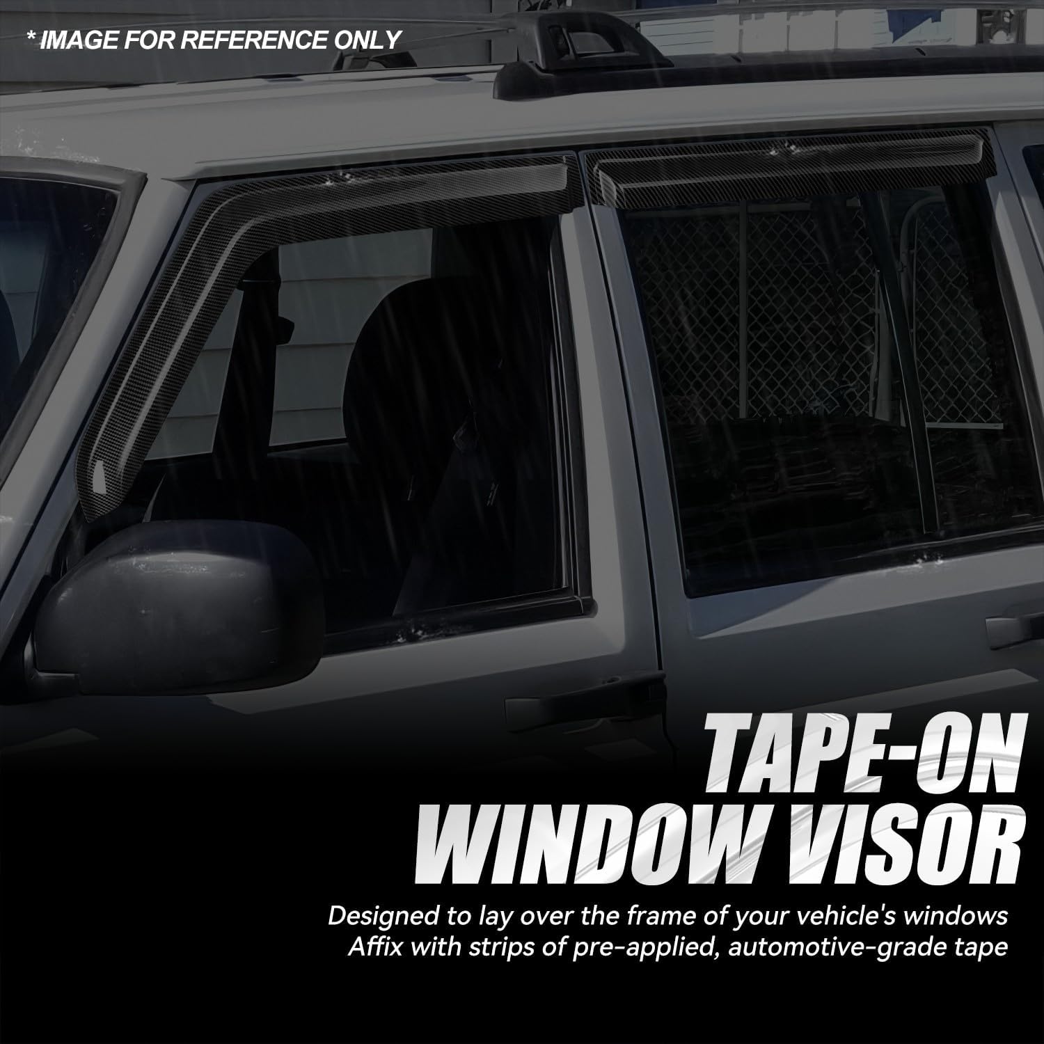 Auto Dynasty 4Pcs Carbon Fiber Pattern Window Visors Compatible with 1984-2001 Jeep Cherokee, Tape-On Front & Rear Window Deflectors Rain Guards Sun Wind Air Side Vent Shade, Glossy Black