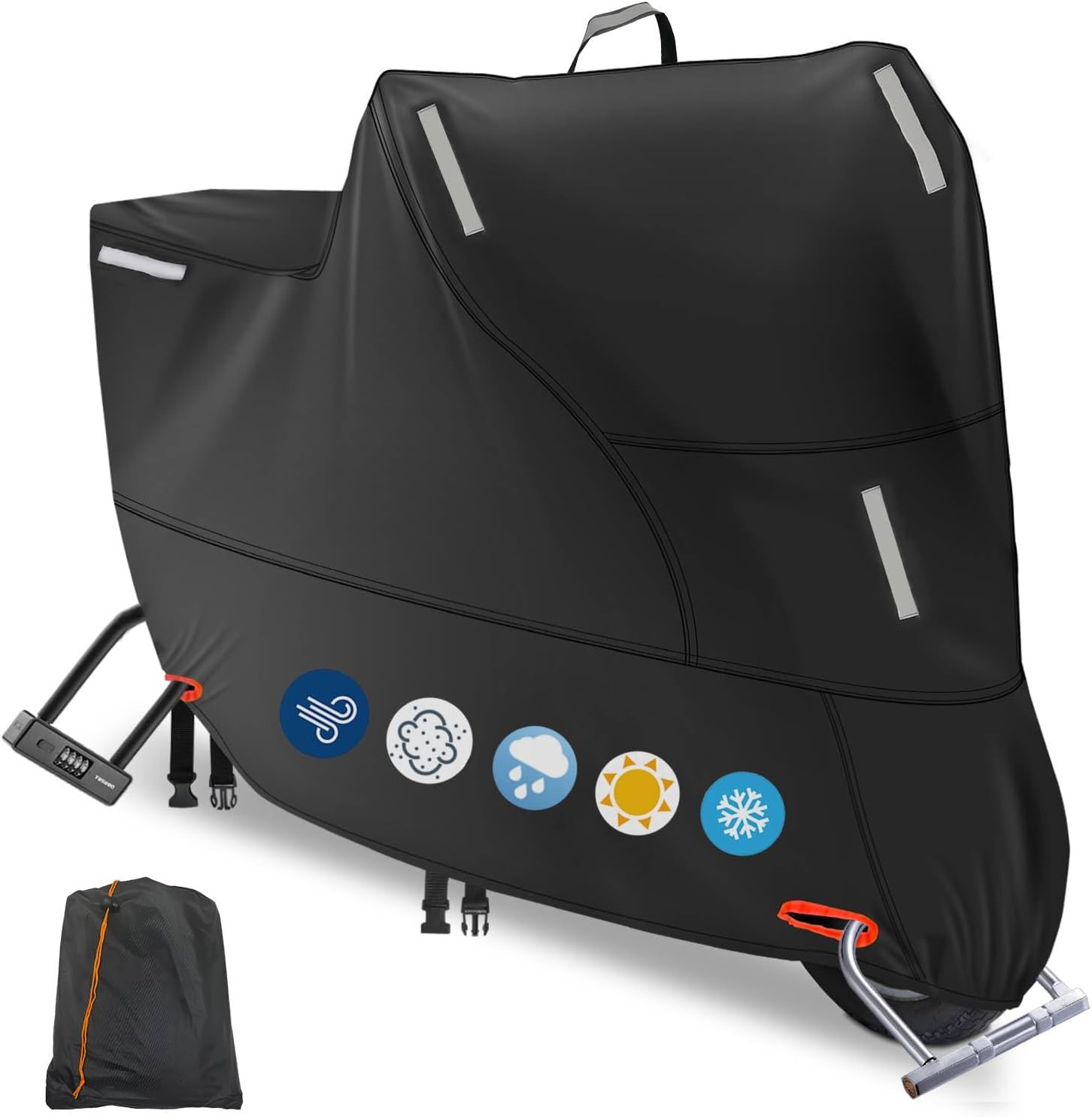 - Windproof Design: The motorbike cover with 2 symmetrical locking holes (locks not included), can combination with the 2 buckle straps at the bottom, 1 is fixed in the middle of the bottom and can't be moved, and the other movable wind-proof buckle strap can be combined with the locks to secure the hood front and back. PLEASE NOTE: Please do not discard the movable buckle straps during installation or storage, there is no replacement or retrieval if you lose this accessory.