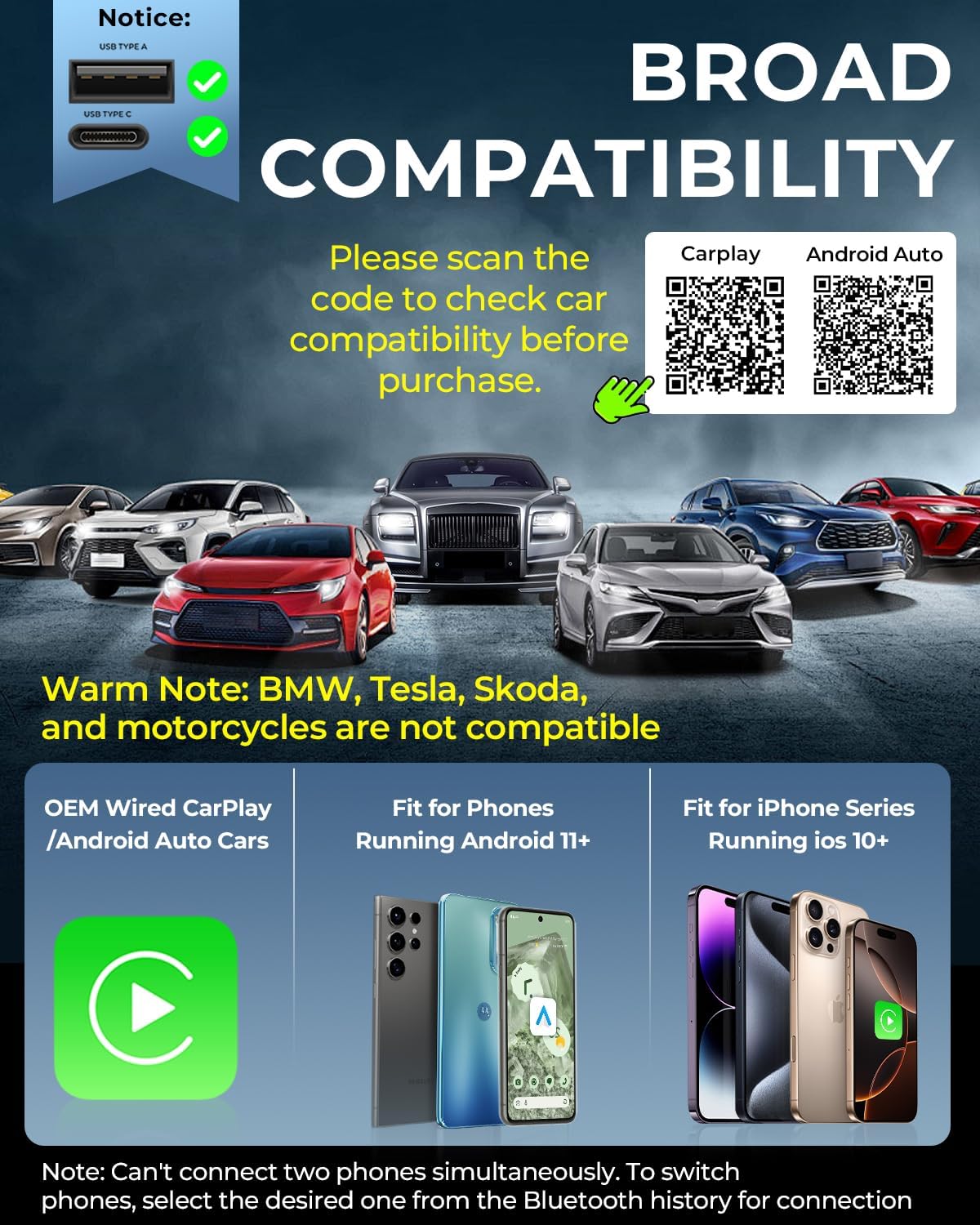 - Wide Compatibility: The wireless carplay adapter is compatible with iPhone 6 & later models running iOS 10 or above, as well as Android phones running Android 11 or above, enabling effortless switching between different operating systems