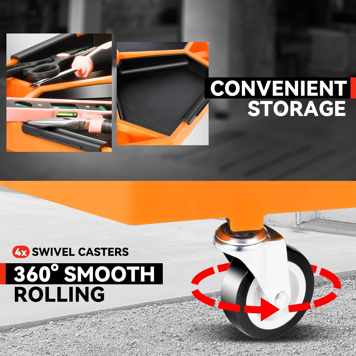 - ăEnhanced MobilityăEquipped with 4 swivel casters, this mechanic stool provides smooth and precise maneuverability around your garage, streamlining your work process.