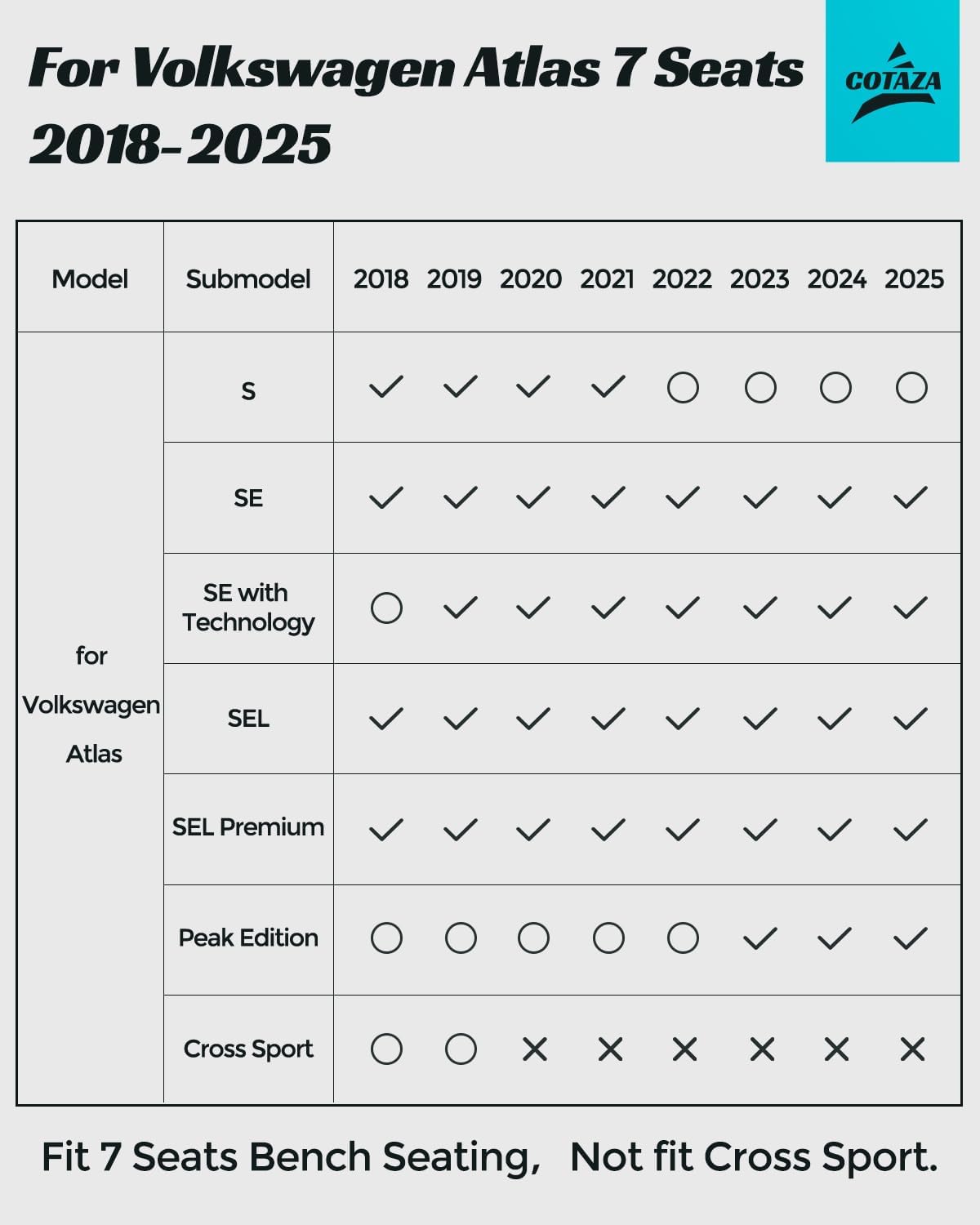 - Custom Floor Mats Full Set : COTAZA uses laser scanning to precisely cut floor mats for Volkswagen VW Atlas 2018-2025(Only fit 7 Seats with 2nd row bench seat, Not fit 6 seats or Cross Sport model). Beyond standard set, we've included back seat cover. The cargo mats for back of suv offer full car protection when you fold down seats or carry large cargo, ensuring your bench seating stays uniformly stylish with a complete COZATA rubber floor mat set