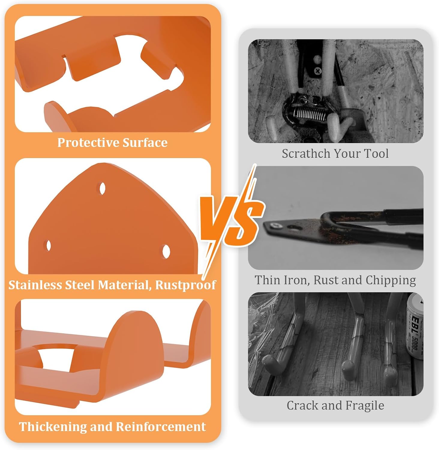 - Sturdy and Premium Materials: The weed eater hanger is made of thickened stainless steel, which is stronger and has high bearing capacity. The surface of the racks is sprayed with orange paint for double protection. The hooks crafted from high-quality nylon materials. Its robust design ensures that your power tools are held securely in place, preventing accidental damage or falls, so you can trust it to keep your tools safe