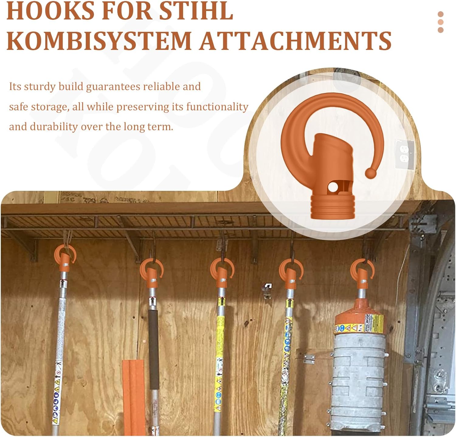 - Hooks Compatible with Stihl Kombi and Dewalt Attachments: Our hanger features a notch and locking mechanism perfectly compatible with Stihl Kombi Attachment storage. Additionally, a small hole at the back makes it compatible with Dewalt Attachments, ensuring maximum versatility