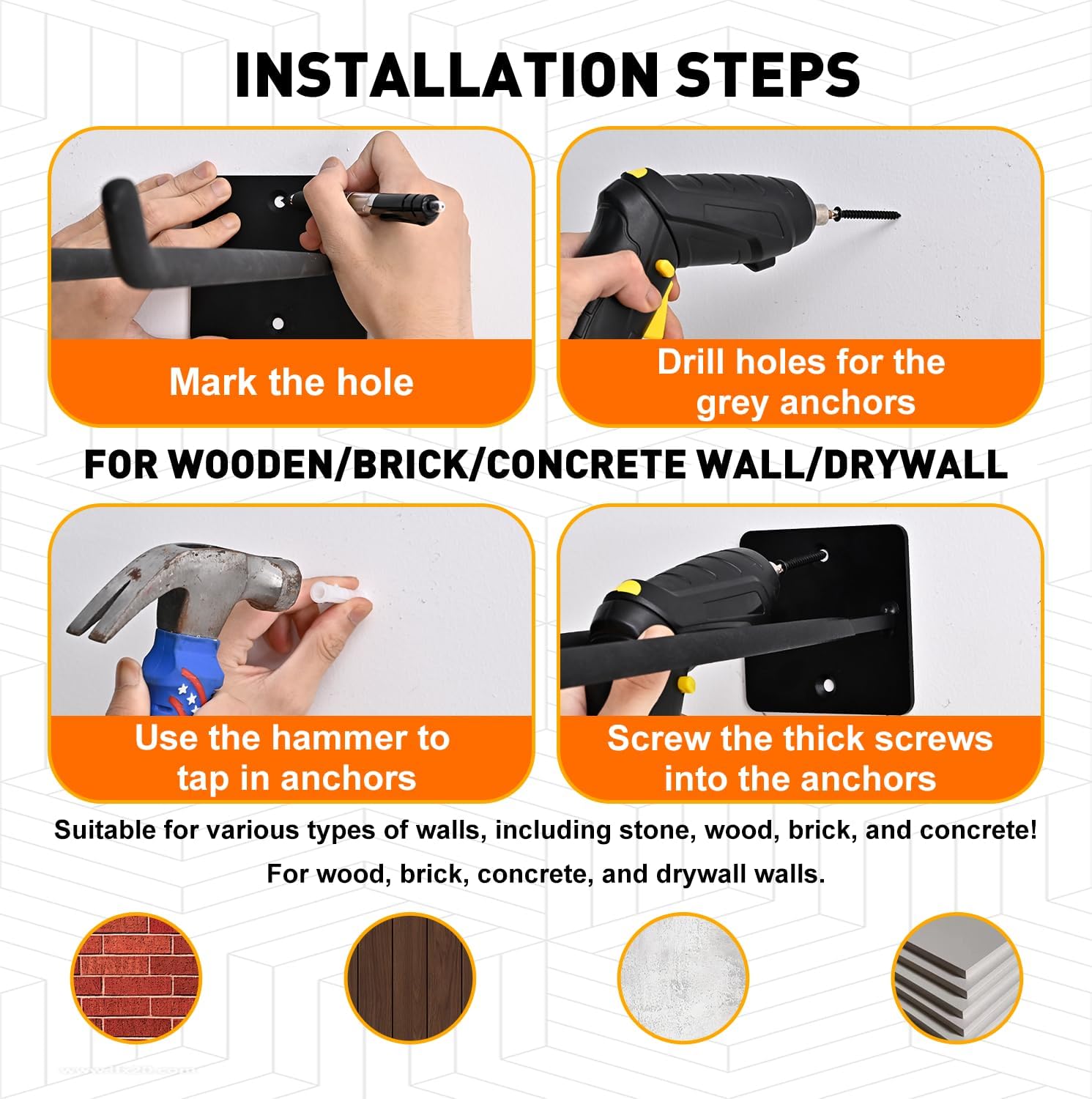 - Installation is very simple, all you need is an electric drill and a level to make sure it lines up with the nails in the wall. Must be on a solid structure when mounted on drywall or other panel wall panels. (All mounting hardware is included.) If you have any questions about garage hooks, please feel free to contact us and we will respond immediately.