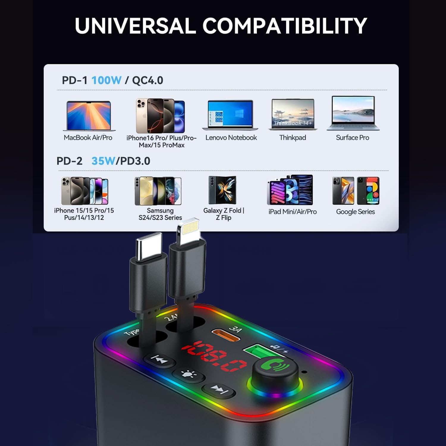 Vitog Retractable Car Charger, Wireless Bluetooth 5.3 FM Transmitter 100W USB C 4 in 1 Fast Car Charger Adapter,iPhone 16 Fast Charging-for iPhone 16 15 14 13 12 Android