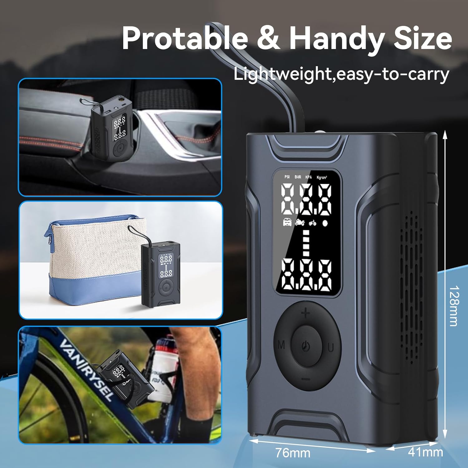- 【Portable】 This portable air pump is small and lightweight, easy for you to carry. You can easily store it in your car, bike rack or backpack. Ideal for maintaining the vehicle optimal tire pressure on daily commutes or long trips.