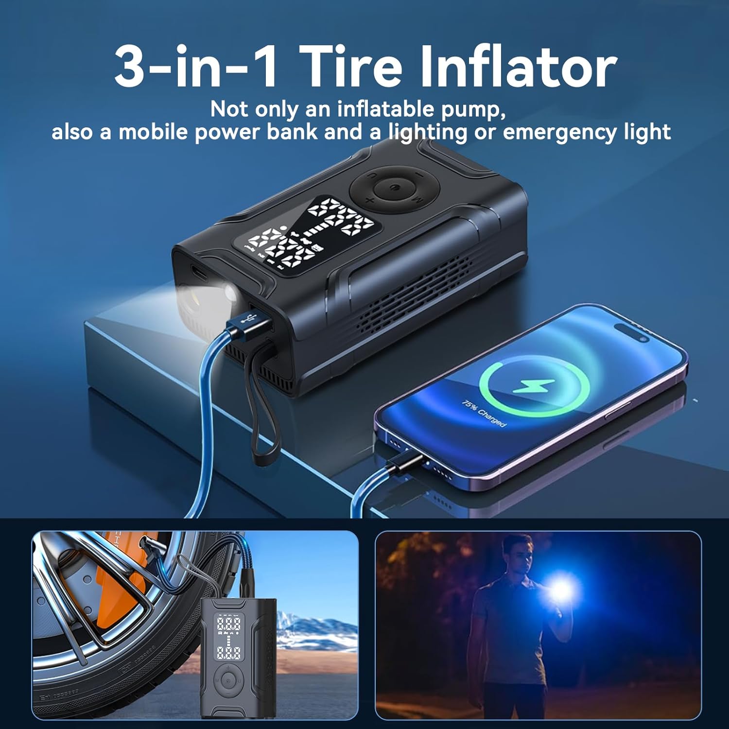 - 【Multifunctional Emergency Tool】 This portable air compressor is equipped with LED emergency light at the top, which allows you to inflate tires in the dark, change tires at night or warn other vehicles in an emergency. The top also includes a USB-C input port/a USB-A output port, which can also be used as an emergency power supply for mobile phones and other devices.