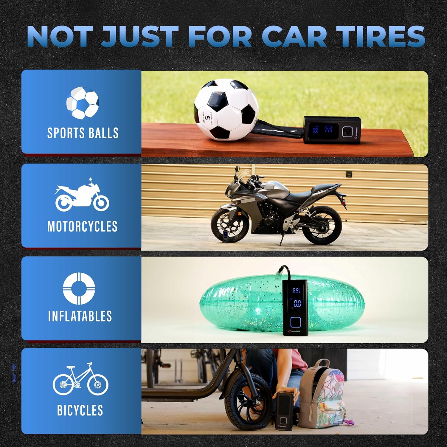 - Special Feature : Cordless, Lightweight, Portable, and Compact, Works on Cars, Bikes, Sports Balls, Inflateables, Built in Night Light and SOS Probe, Easy to read Digital Pressure Gauge Cordless, Lightweight, Portable, and Compact, Works on Cars, Bikes, Sports Balls, Inflateables, Built in Night Light and SOS Probe, Easy to read Digital Pressure Gauge