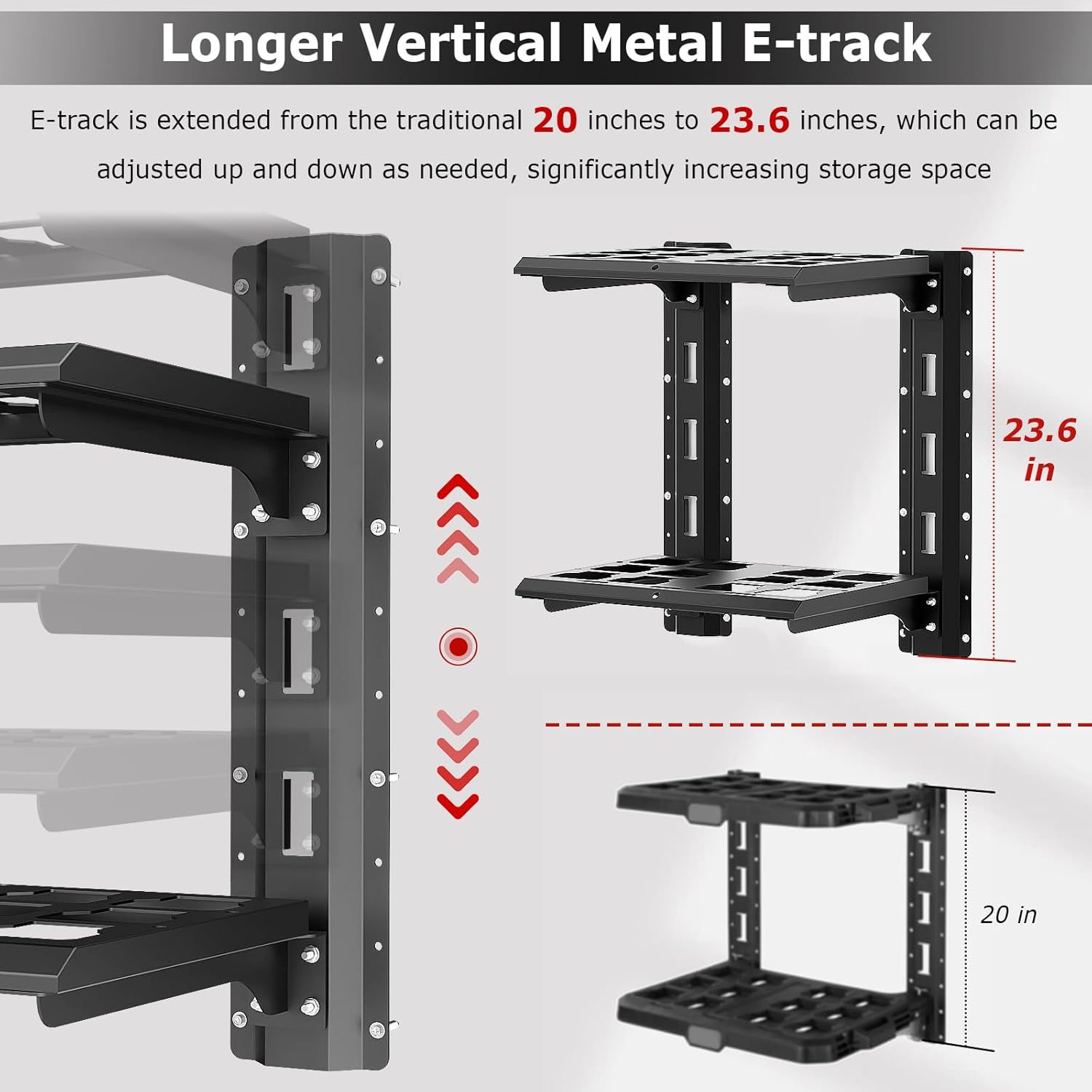 - Extended Track Design: Equipped with a sturdy metal frame and extended vertical E-tracks, from the traditional 20 inches to 23.6 inches, it can be adjusted up and down as needed, significantly increasing storage space. At the same time, it improves the durability and load-bearing capacity of the racking system, suitable for storing more goods or larger items