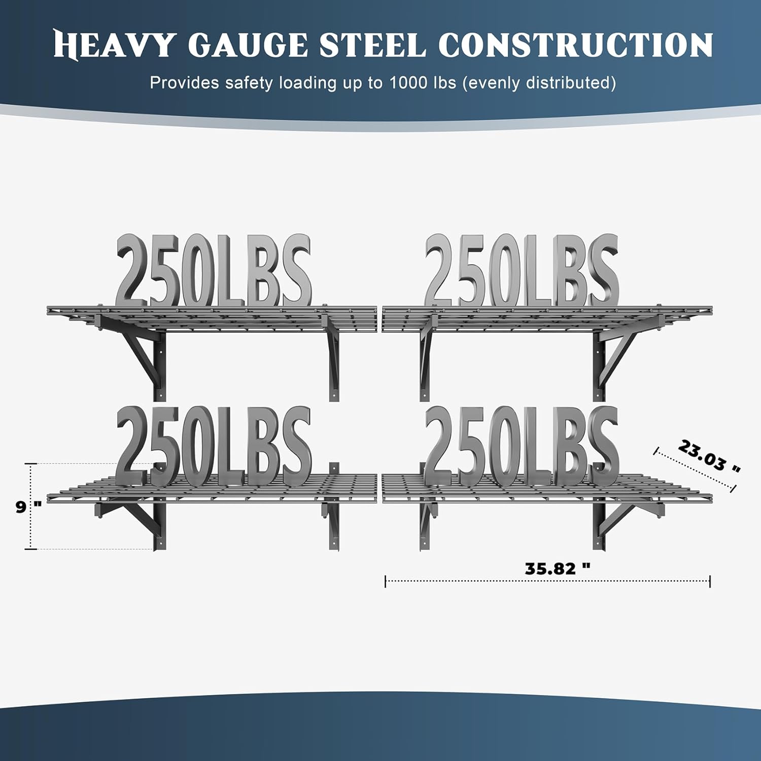 - đăHeavy-Duty Load Capacityă- Jusgym garage shelving wall mounted system is engineered with premium steel, offering exceptional strength. Each 2x3ft bracket holds up to 250 lbs, and with 4 shelves totaling 1000lbs capacity, it effortlessly stores bulky items like tools, tires, and heavy storage bins. Built to last, even under extreme weight!