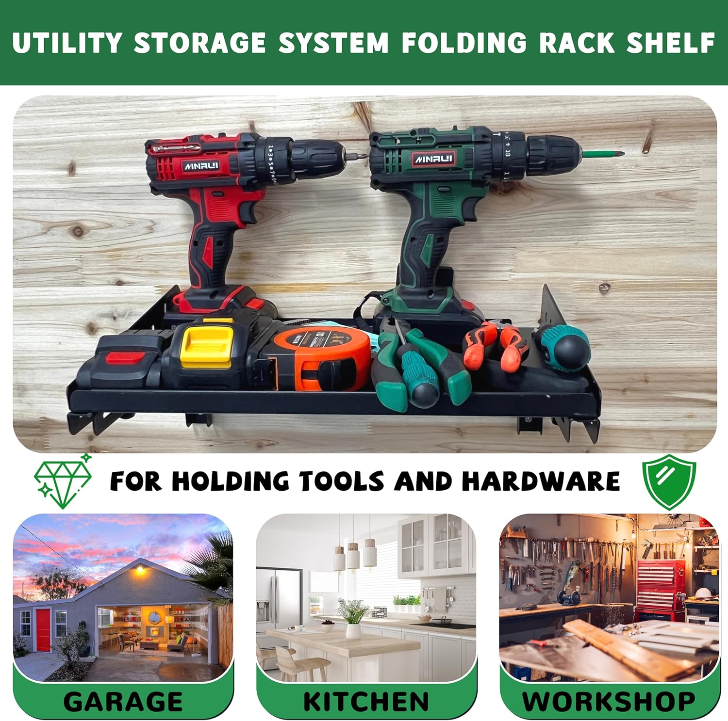 - [Space Saving Adjustable Rail Shelf]: The wall mounted shelf is an ideal solution for optimizing space. Because it can easily fold flat against the wall when not needed, instantly free up valuable floor space. keeping your garage organized and tidy