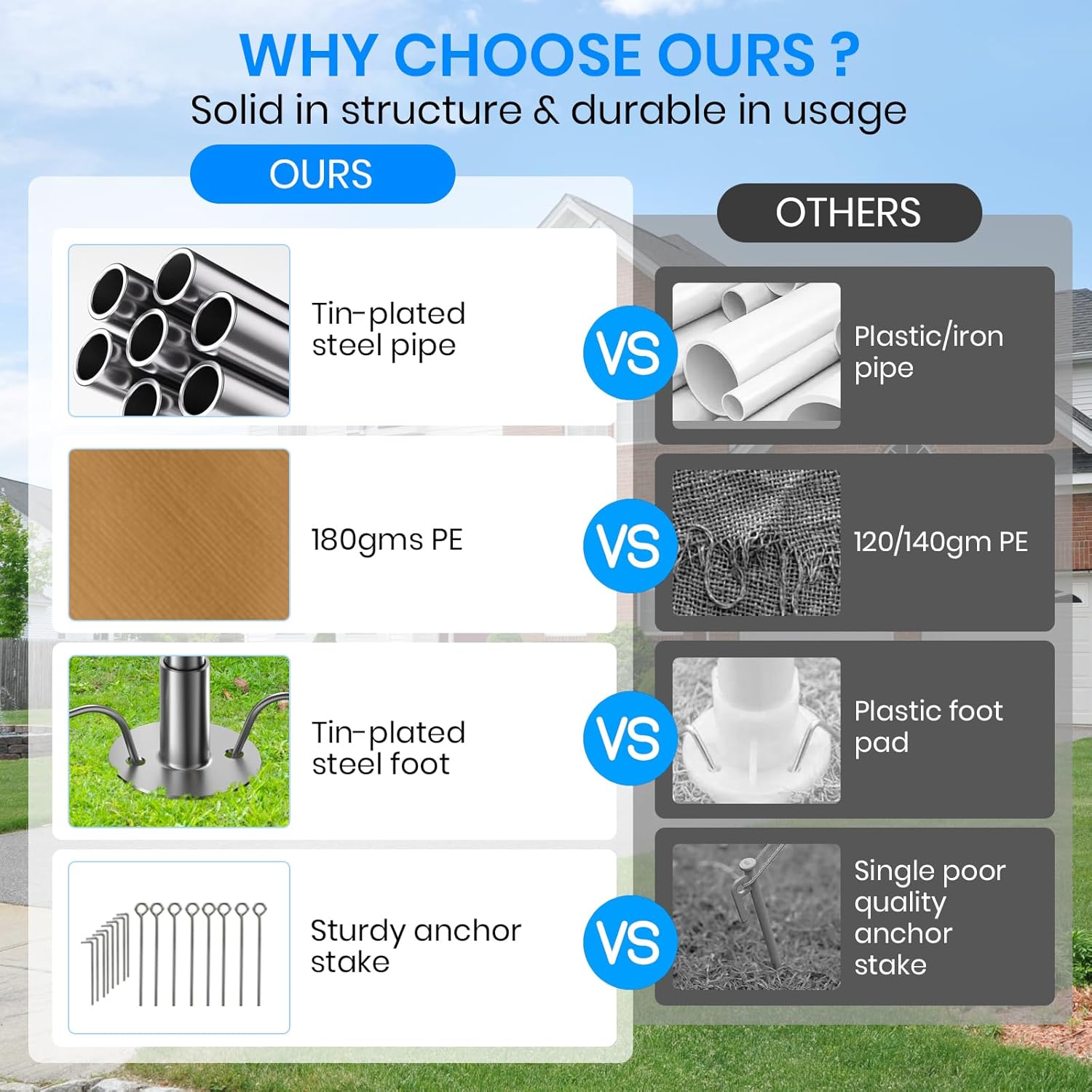 - Note:Please add extra securing measures in wind areas, such as sandbags, concrete weights, or additional anchors and guylines;If you are in an area with frequent snowfall, please take care to clear the top of the carport of snow.