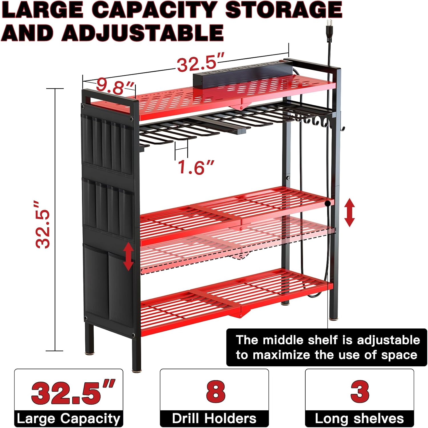 Large Power Tool Organizer Cart with Charging Station 8 Drill Holder Garage Storage Standing Heavy Duty and Stability Storage Rack Utility Tool Shelf (Red)