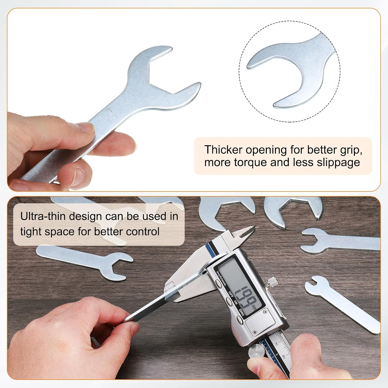 - Size - Open end: 30mm / 1.18"; Open outside width: 49mm / 1.93"; Total length: 138mm / 5.43"; Stem thickness: 2.2mm / 0.09"; Stem width: 17mm / 0.67"; Color: Silver-grey; Package includes: 10 x Single open-end wrenches. The open wrench set is thin enough to work on tight spots.