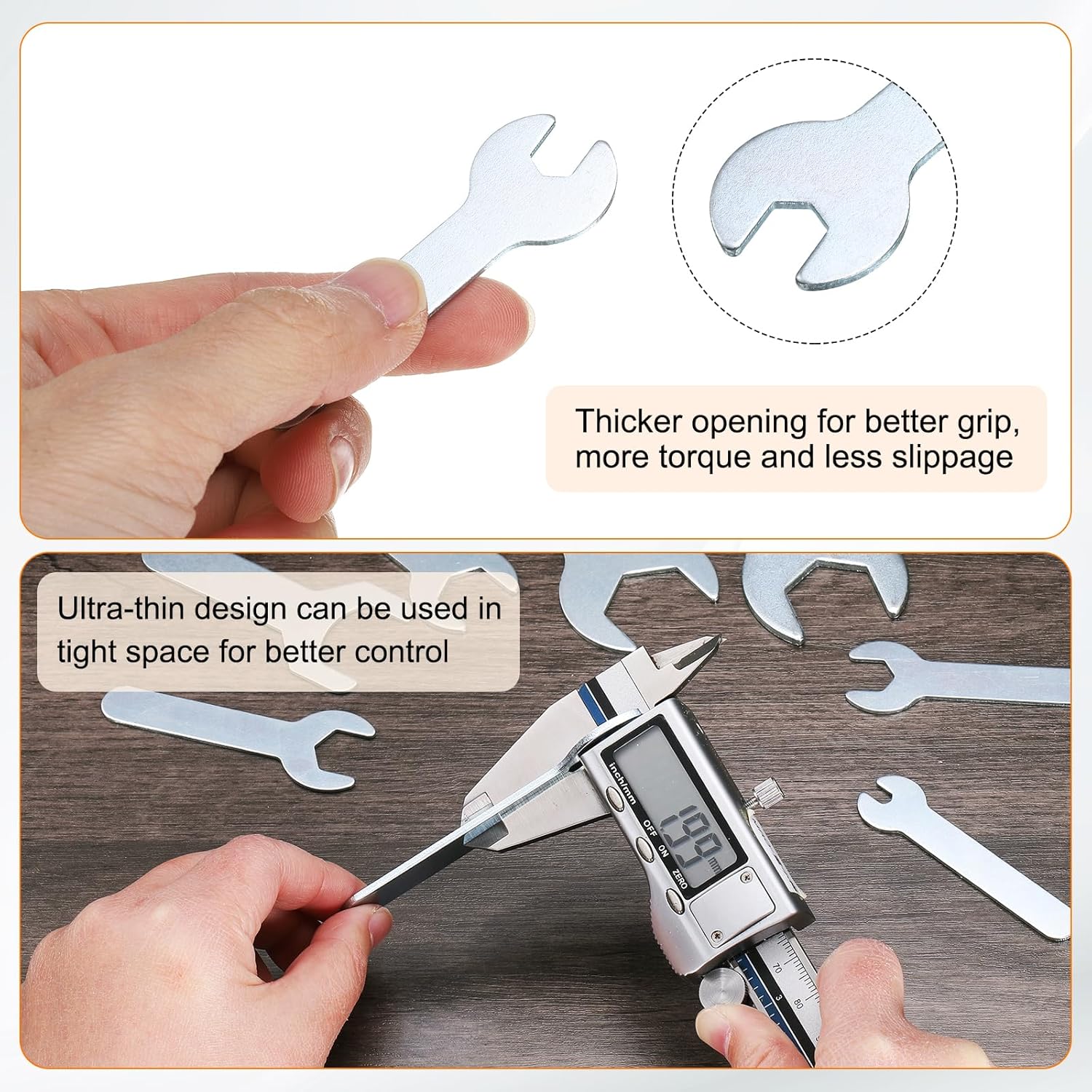 - Size - Open end: 7mm / 0.28"; Open outside width: 22mm / 0.87"; Total length: 66mm / 2.6"; Stem thickness: 1.5mm / 0.06"; Stem width: 10mm / 0.39"; Color: Silver-grey; Package includes: 10 x Single open-end wrenches. The open wrench set is thin enough to work on tight spots.