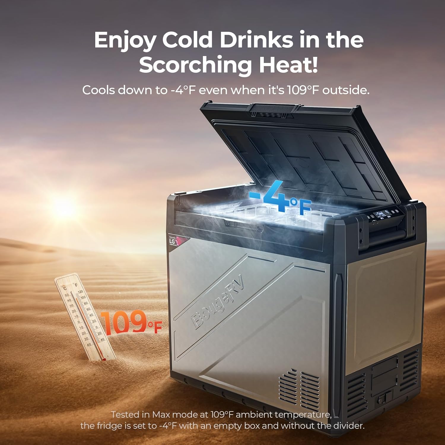 - Capable of Reaching -4℉ Even at 109℉ Ambient Temp: Using a 5.7cc LG compressor, the Rocky V2.0 81 quart portable refrigerator can cool down to -4℉ even in an ambient temp of 109℉, ensuring that frozen goods stays as fresh as possible even in hot environments and let you have a better outdoor experience