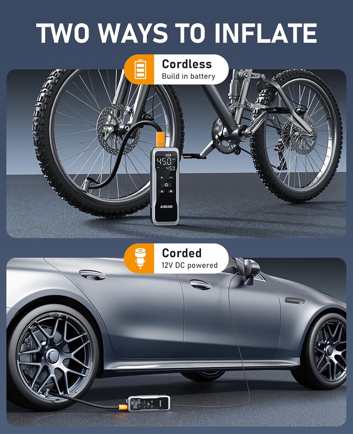 - Dual Power Air Compressor - Powered by lithium battery and 12V DC input, It offers an air flow rate of 34L/MIN with a max tire pressure of 150PSI. In 1 MIN, it can inflate a tire from 25 to 36 PSI, it can handle up to 18 inflations on a single charge. The 12V DC cigarette lighters charging cable ensures reliability during emergencies or power lags. Whether you're on a road trip or in a hurry for work, this inflator ensures you can quickly top up your tires. Compact yet mighty for cars, moto, bikes, and ball.