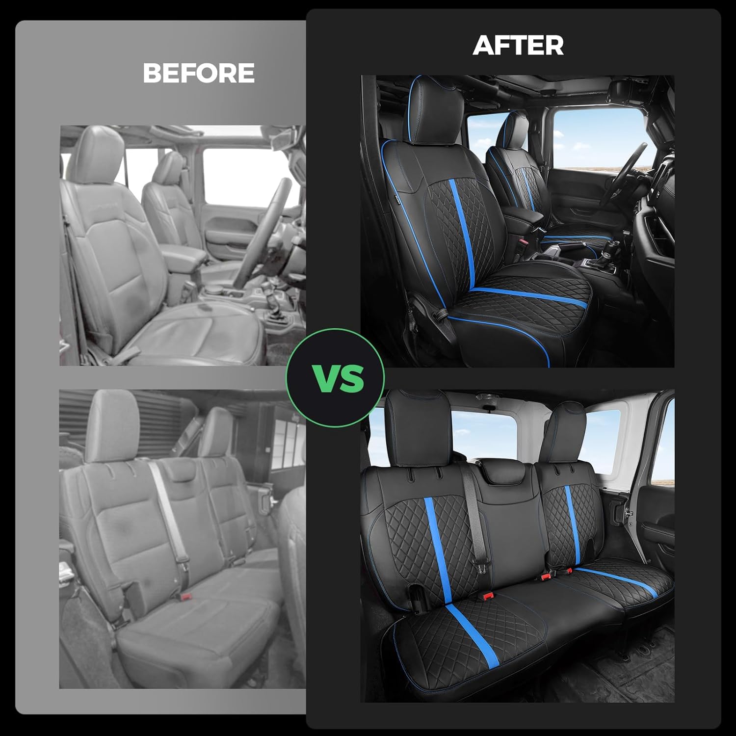 - ăSuperior Car Seat Protectoră: These waterproof seat covers for Jeep Wrangler 4 Door JL adopts a four-layer structure, providing exceptional protection capabilities to safeguard your car seats from coffee spills and pet scratches. It is also easy to clean, simply wipe with damp cloths to make your waterproof car seat cover looks brand new for years.
