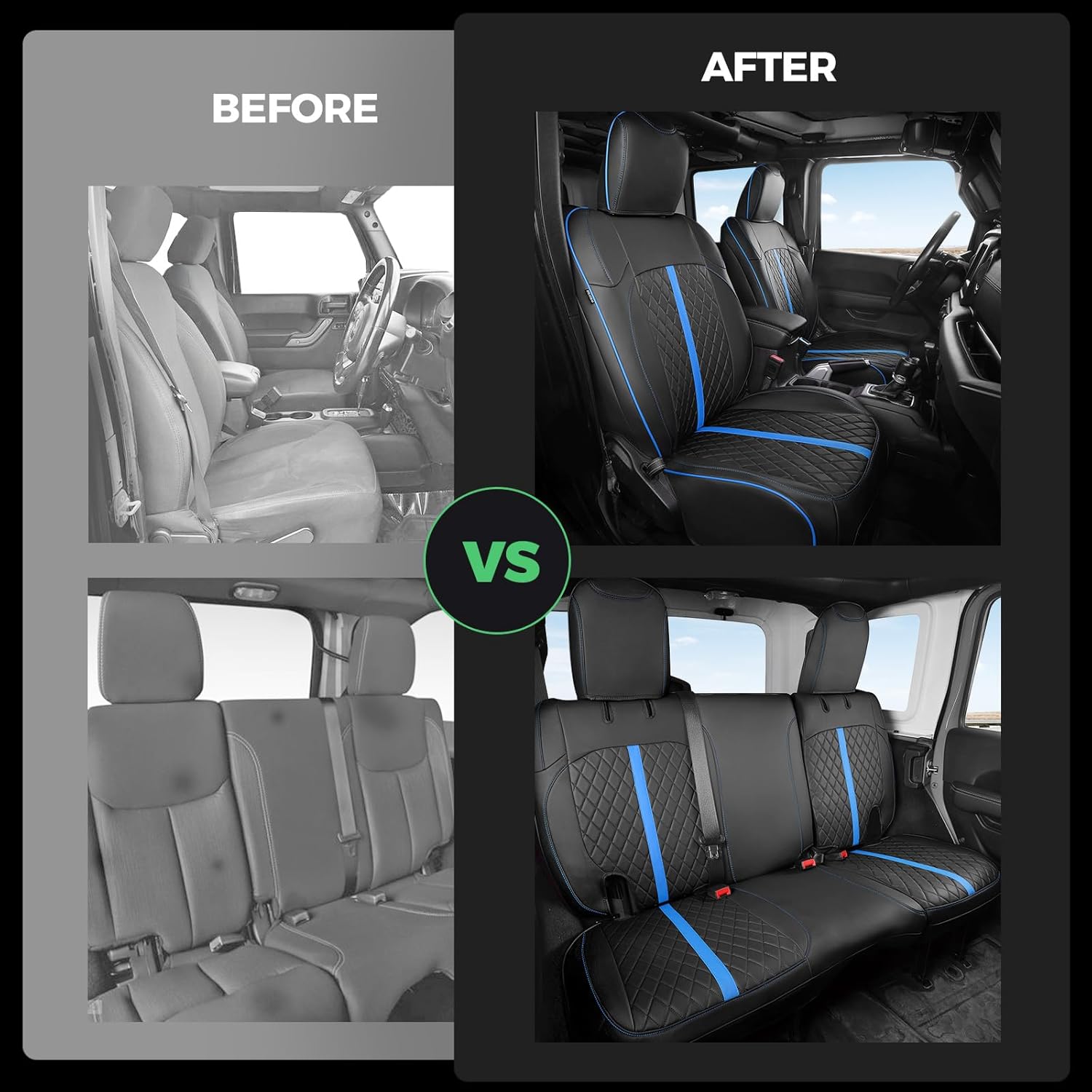 - ăSuperior Car Seat Protectoră: These waterproof seat covers for Jeep Wrangler 4 Door JL adopts a four-layer structure, providing exceptional protection capabilities to safeguard your car seats from coffee spills and pet scratches. It is also easy to clean, simply wipe with damp cloths to make your waterproof car seat cover looks brand new for years.