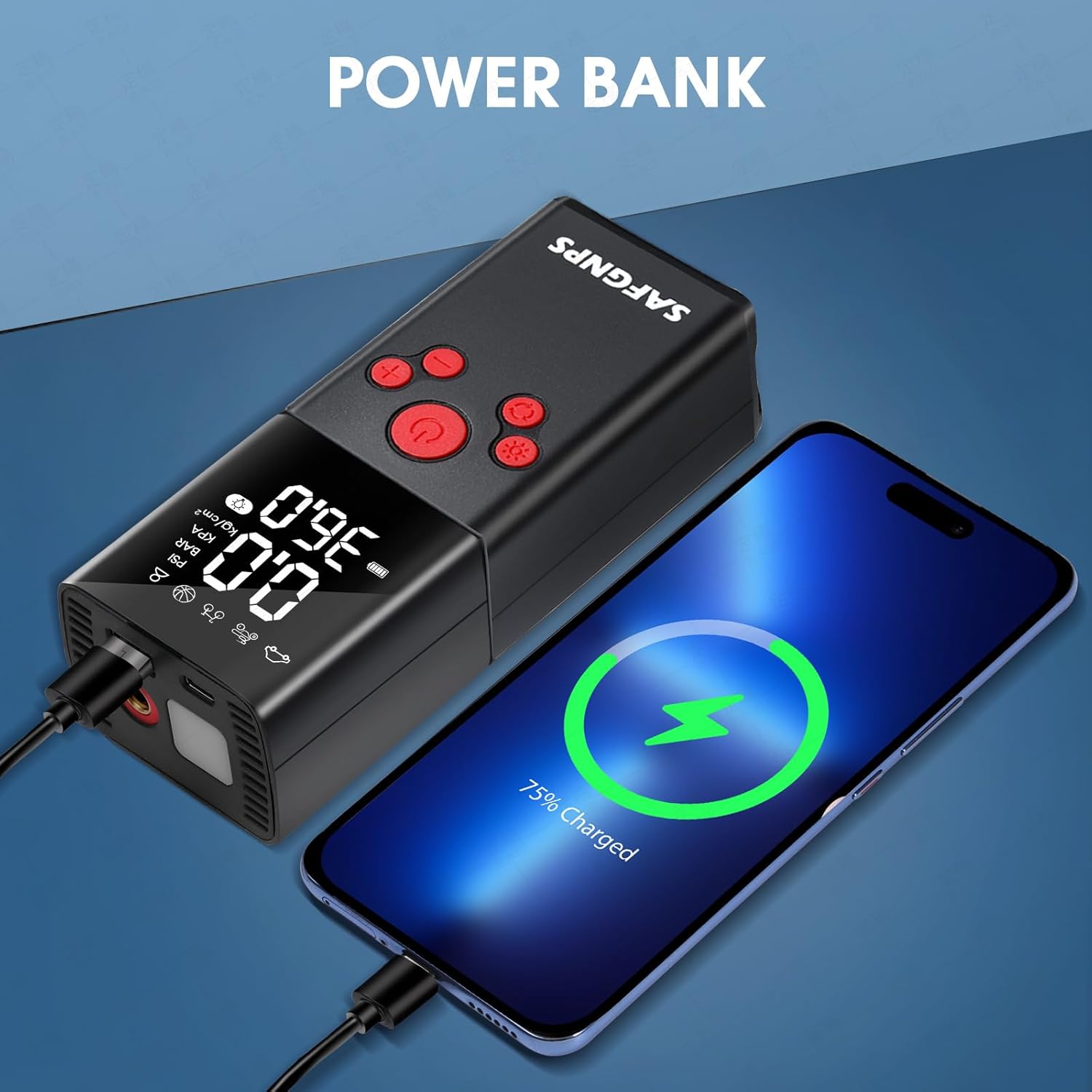 - 【All-in-One Device】Not just an inflator air pump: Portable tire pump for car features 3 LED emergency modes (SOS, Steady, Strobe) for nighttime/emergency use Battery air pump includes Power Bank function to charge your devices in emergencies