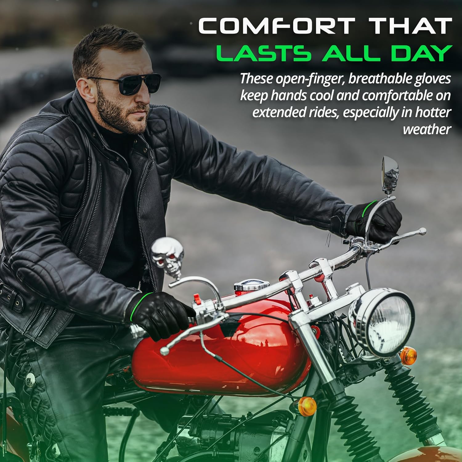 - LEATHER MOTORCYCLE GLOVES - aaasportx black and green Motorcycle Gloves are made of premium quality Genuine Leather. Our Lightweight Motorcycle Gloves ensures durability through a variety of situations. aaasportx Motorcycle Gloves for Men offer a high-quality, stylish, and durable finish that excludes sophistication and toughness on the road.