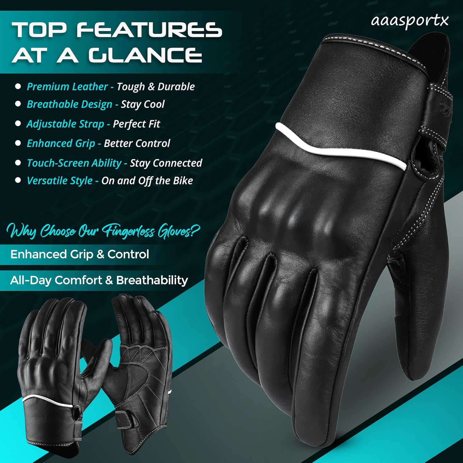 - LEATHER MOTORCYCLE GLOVES - aaasportx black white Motorcycle Gloves are made of premium quality Genuine Leather. Our Lightweight Motorcycle Gloves ensures durability through a variety of situations. aaasportx Motorcycle Gloves for Men offer a high-quality, stylish, and durable finish that excludes sophistication and toughness on the road.