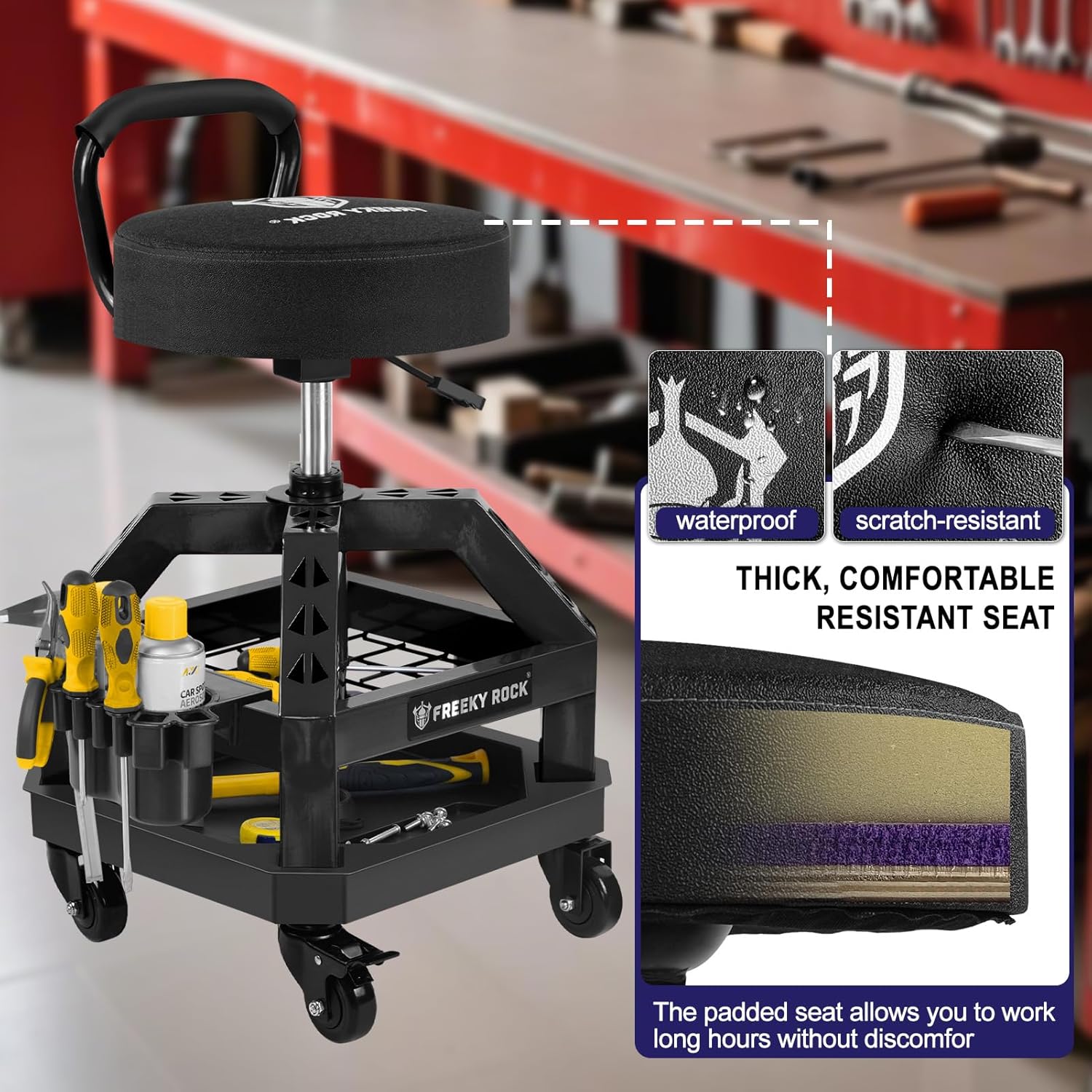 - Comfortable Rolling Shop Chair - the garage shop chair with removable handle backrest provides high back lumbar support and reduces fatigue during long hours of work. 3.5 inch thick seat cushion is made of waterproof, scratch resistant, anti slip leather and high-quality memory foam padding, ensuring comfortable even during extended periods of sitting. In addition, Our Rolling Seat with square tube and steel ring structure provides space for resting the feet.