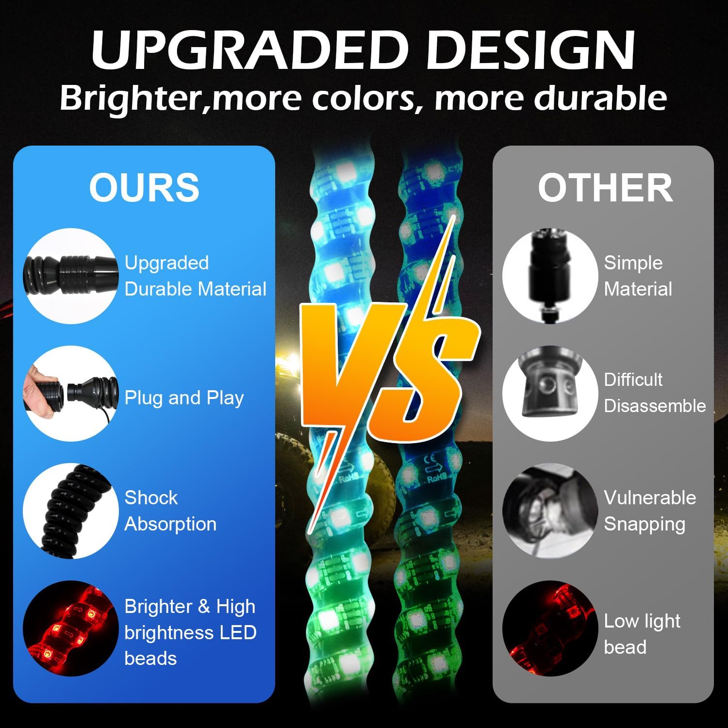 - ăUpgrade Aluminum Spring Base and Strongă: Whip lights for side by side come with two rugged spring bases. The reinforced spring base has more spring coils and a thicker diameter than others,ensuring greater elasticity and better pressure buffering. IP67 Waterproof,Sandproof,Shockproof. Durable to last. Gives you more confidence when you are offroad on tough terrains or in extreme weather