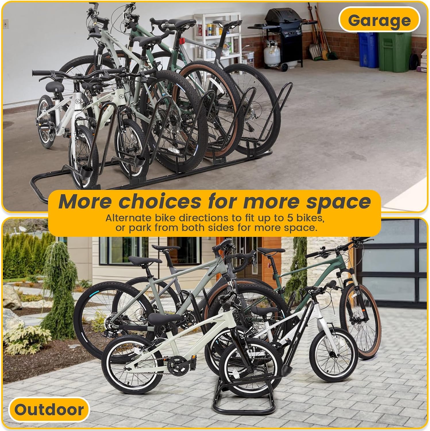 - Reinforced Base for Stability & Space-Saving Parking: Sturdy base plates prevent wheel holders from widening at the top, ensuring bikes stay upright and stable. Alternate bike directions to fit up to 5 bikes, or park from both sides for more space