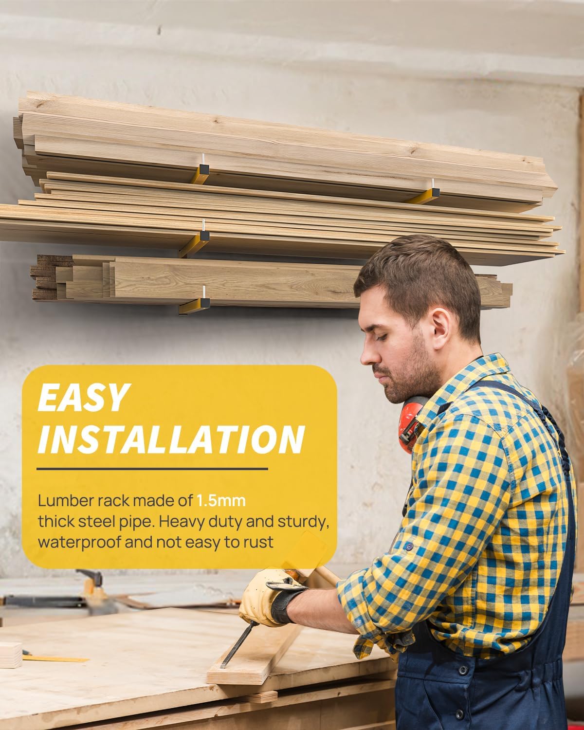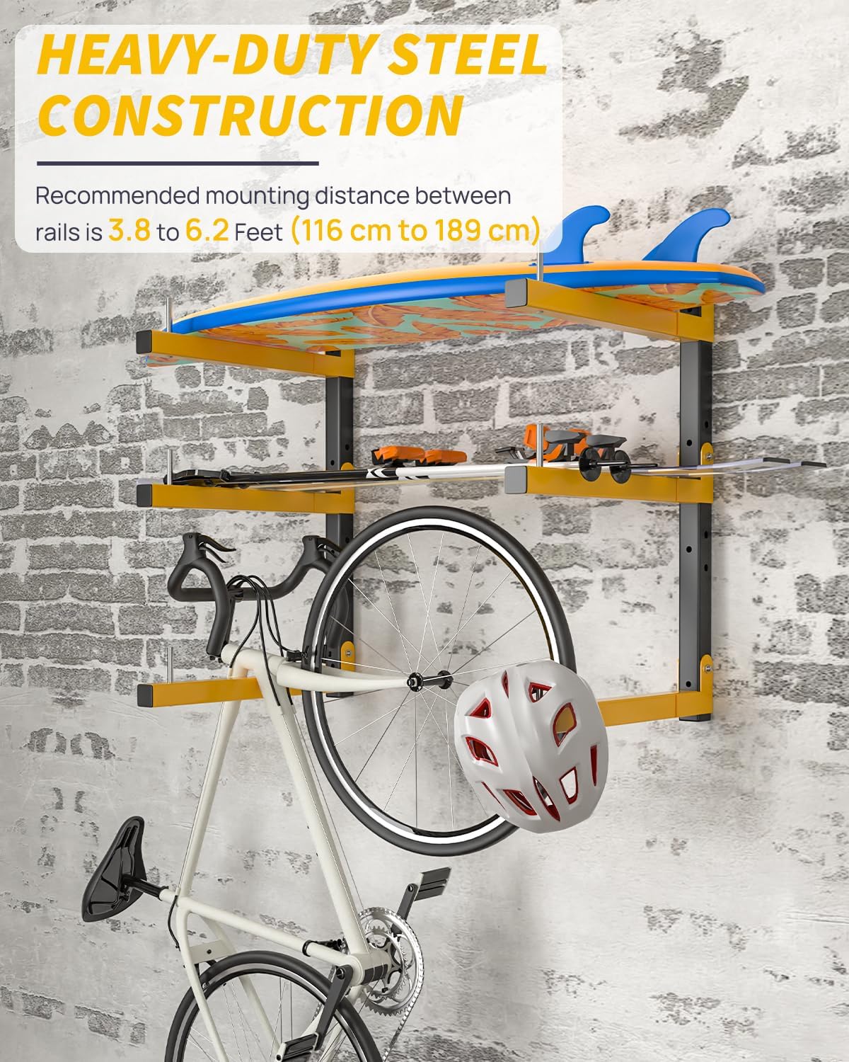- LUMBER STORAGE RACK WALL MOUNT: Wood storage rack is suitable for various walls, such as concrete wall, wood panel wall, red brick wall, etc. The yellow arm is 16 inches long, and the middle bracket moves up and down 4 inches according to the storage size. The Lumber rack storage space size is (7 inches) and (11 inches) The recommended installation distance between the rails is 3.8 to 6 feet, which can be adjusted according to your needs