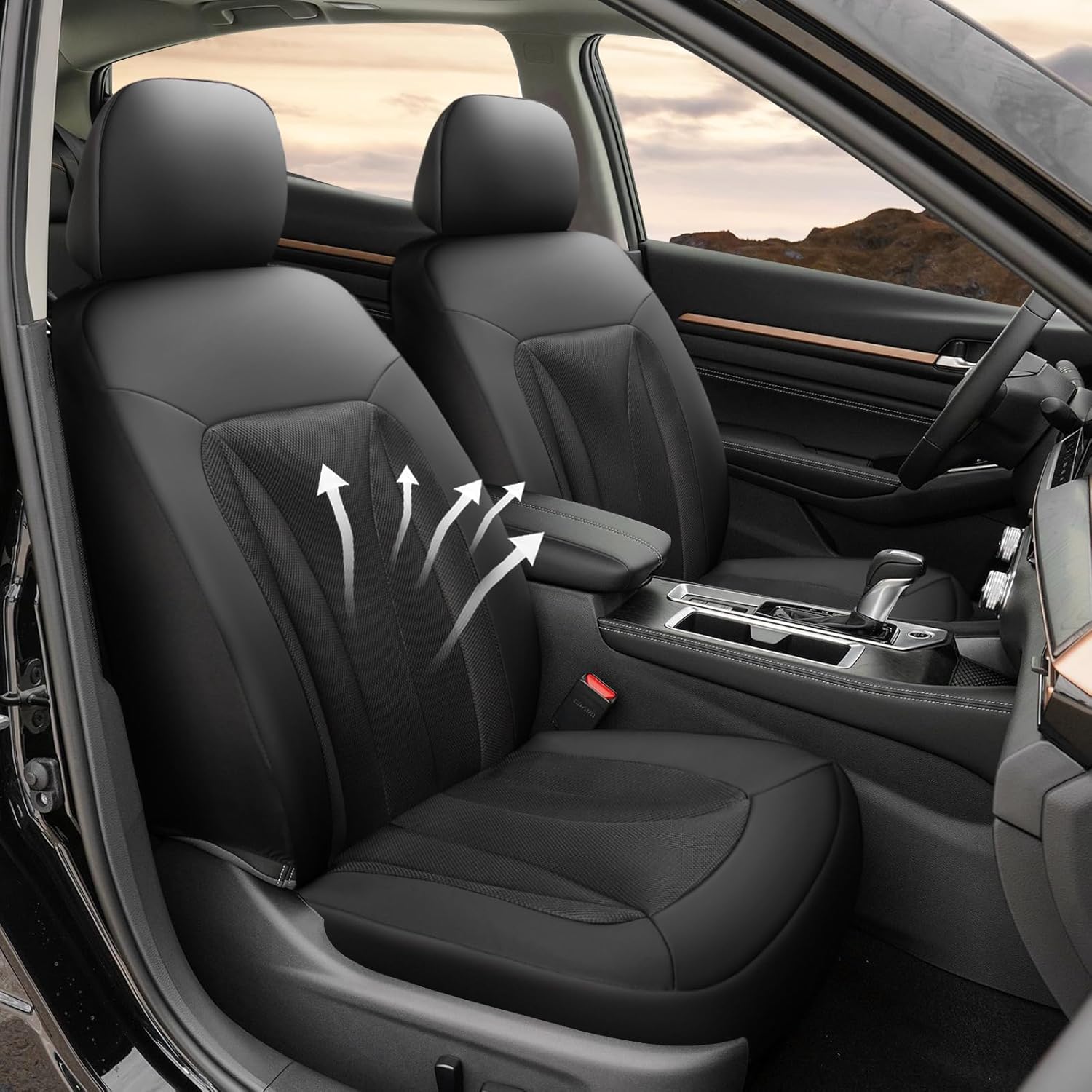 - Breathable 3D Air mesh: Our car seat covers combine premium faux leather with breathable mesh fabric. The faux leather provides a luxurious look and durability, while the honeycomb mesh design on the backrest and seat ensures excellent breathability and cooling, keeping you comfortable during long drives and in hot weather.