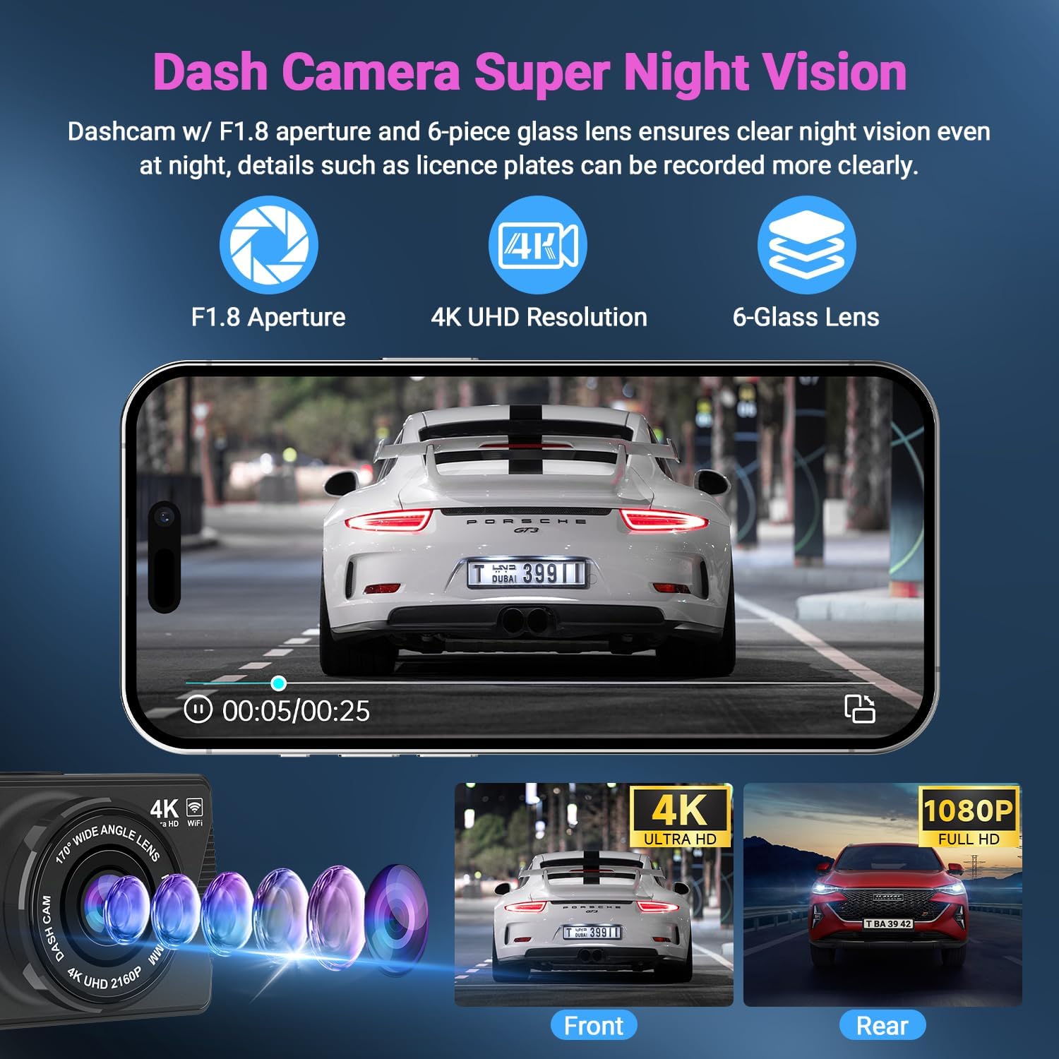 - ă4K+1080P DUAL RECORDING DASH CAMă- Dashcam record video in ultra-high definition 4K front+1080P rear.Dash cam front is equipped w/advanced Starvis sensor and six-glass lens.High-resolution recording capability helps you capture critical details like road signs license plates.To reduce blind spots,dash camera for cars features 170°wide-angle lens in front and 140°wide-angle lens in rear.Car camera is especially useful for preserving and presenting evidence in the event of accidents or collisions