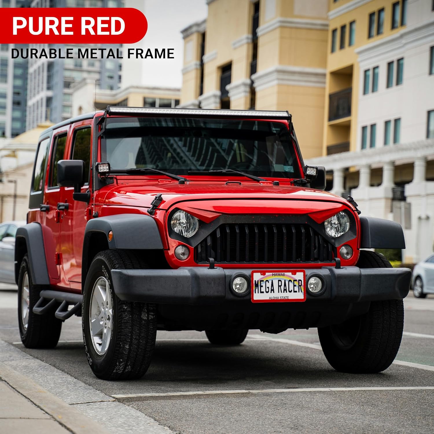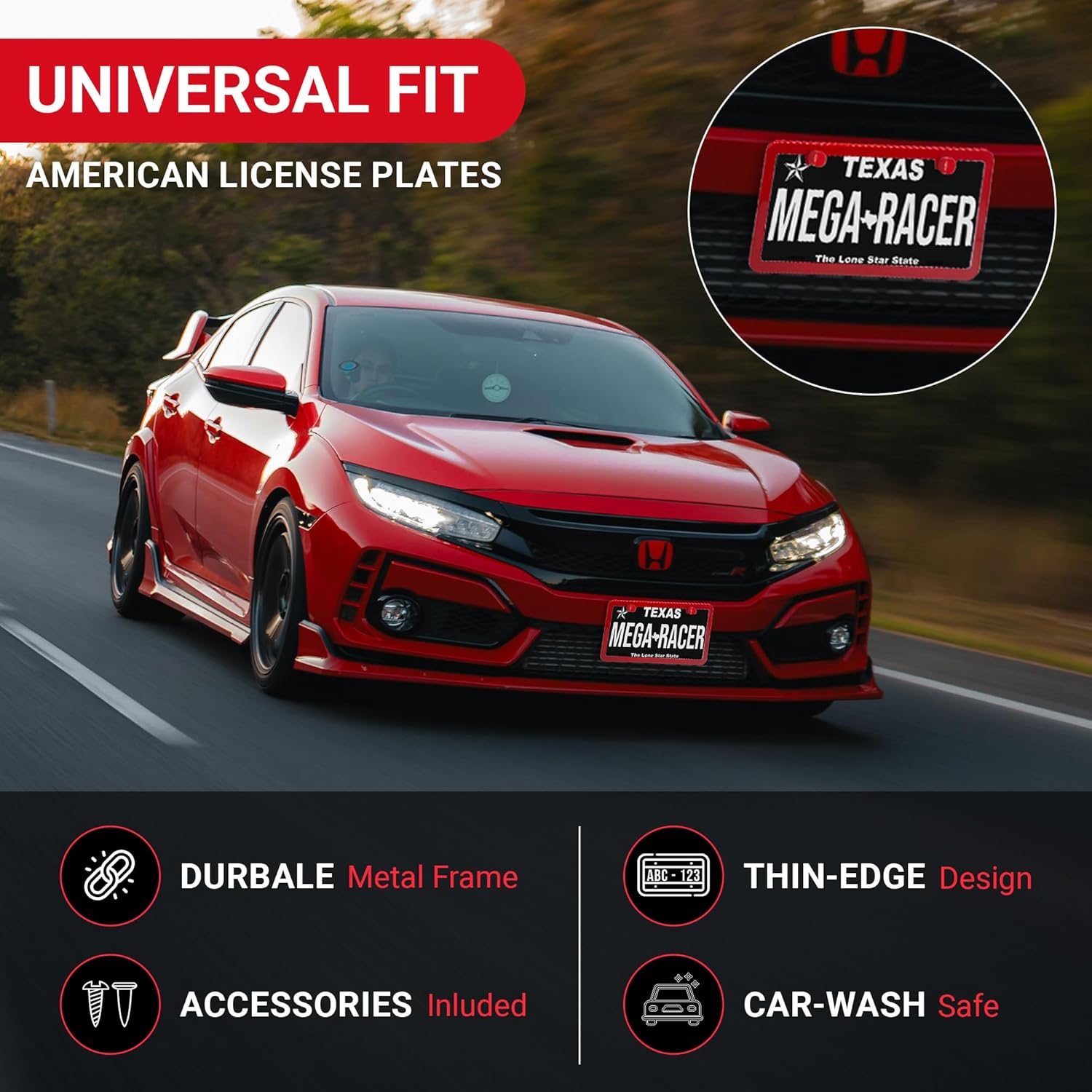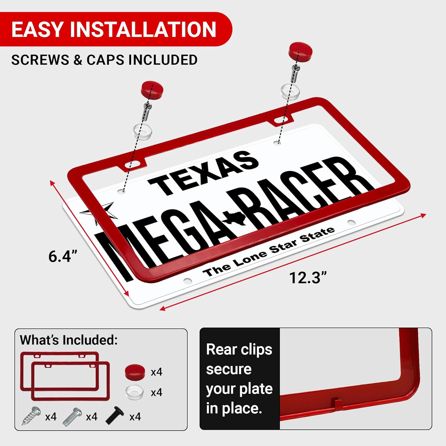 - STRONG DURABLE QUALITY: Our 2 pc License Plate Frame Red Holder is made strong to uphold anything from car washes to weather changes. Mega Racer's red license plate frames are RATTLE PROOF and RUST RESISTANT keeping your vehicle paint SCRATCH FREE.