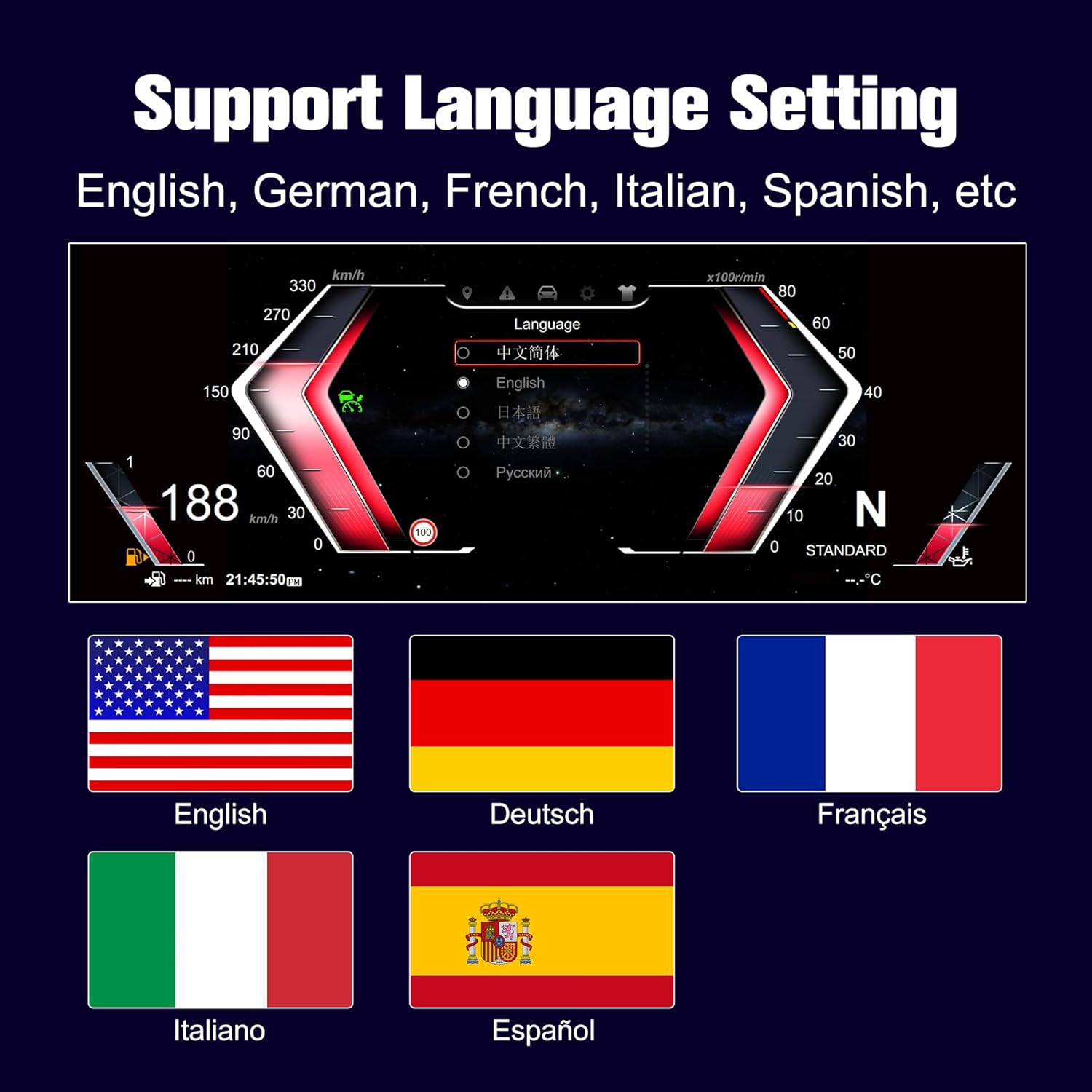 - 🚨[Note] This digital display speedometer supports switching between miles and kilometers and offers support for eight languages. It also supports original car control and is compatible with the original car's cruise control function, this cluster doesn't support the HUD function