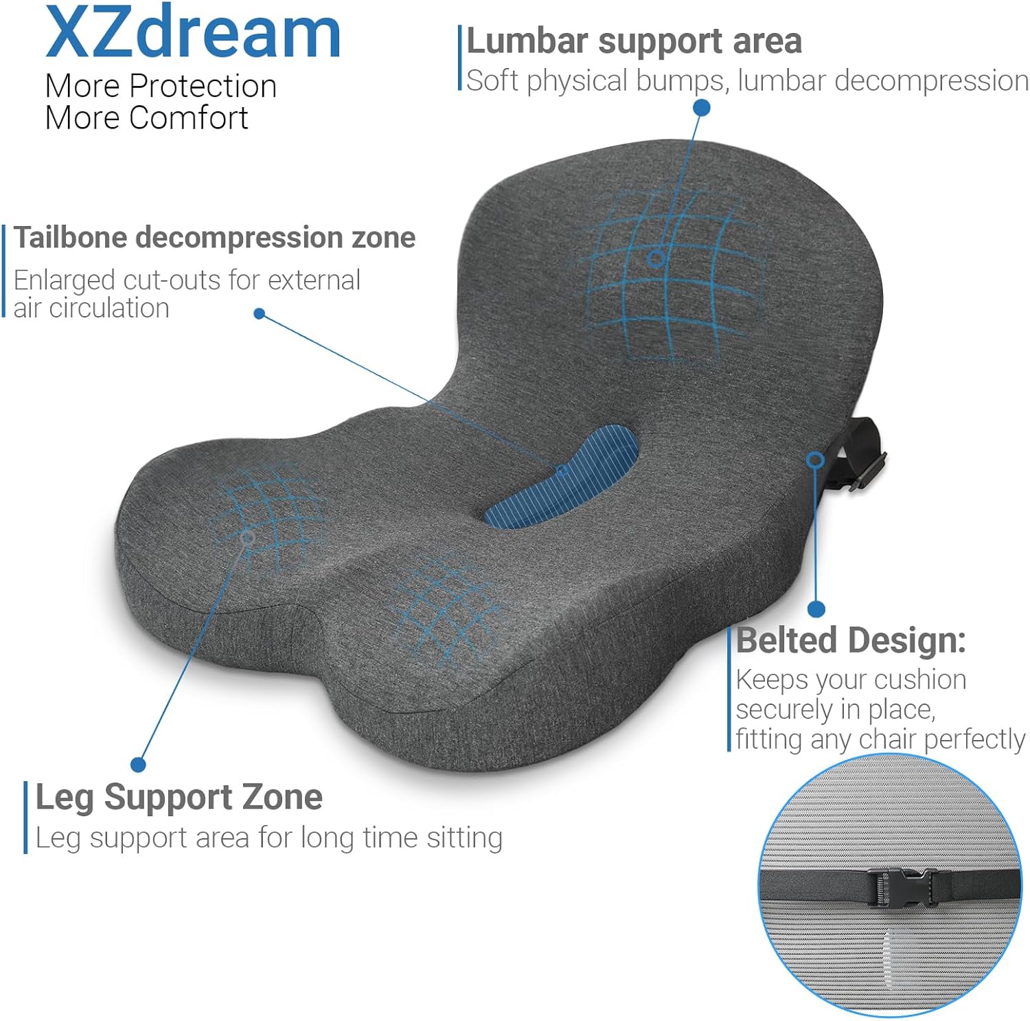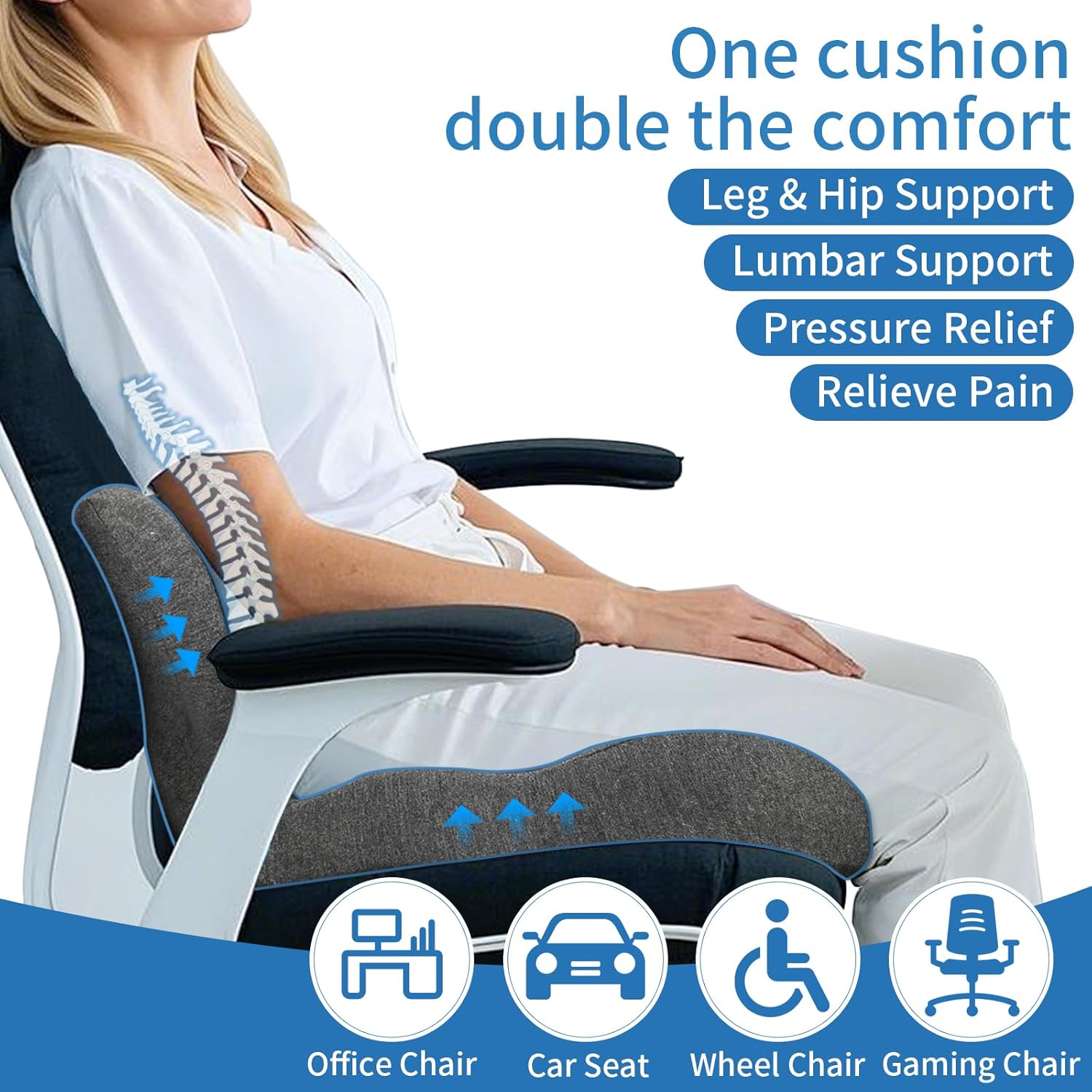 - One Cushion, Double Comfort: Our uniquely molded one-piece design combines lumbar support and seat cushion comfort, offering comprehensive support that alleviates discomfort from prolonged sitting. Say goodbye to hip and lower back pain, including sciatica, and enjoy all-day comfort